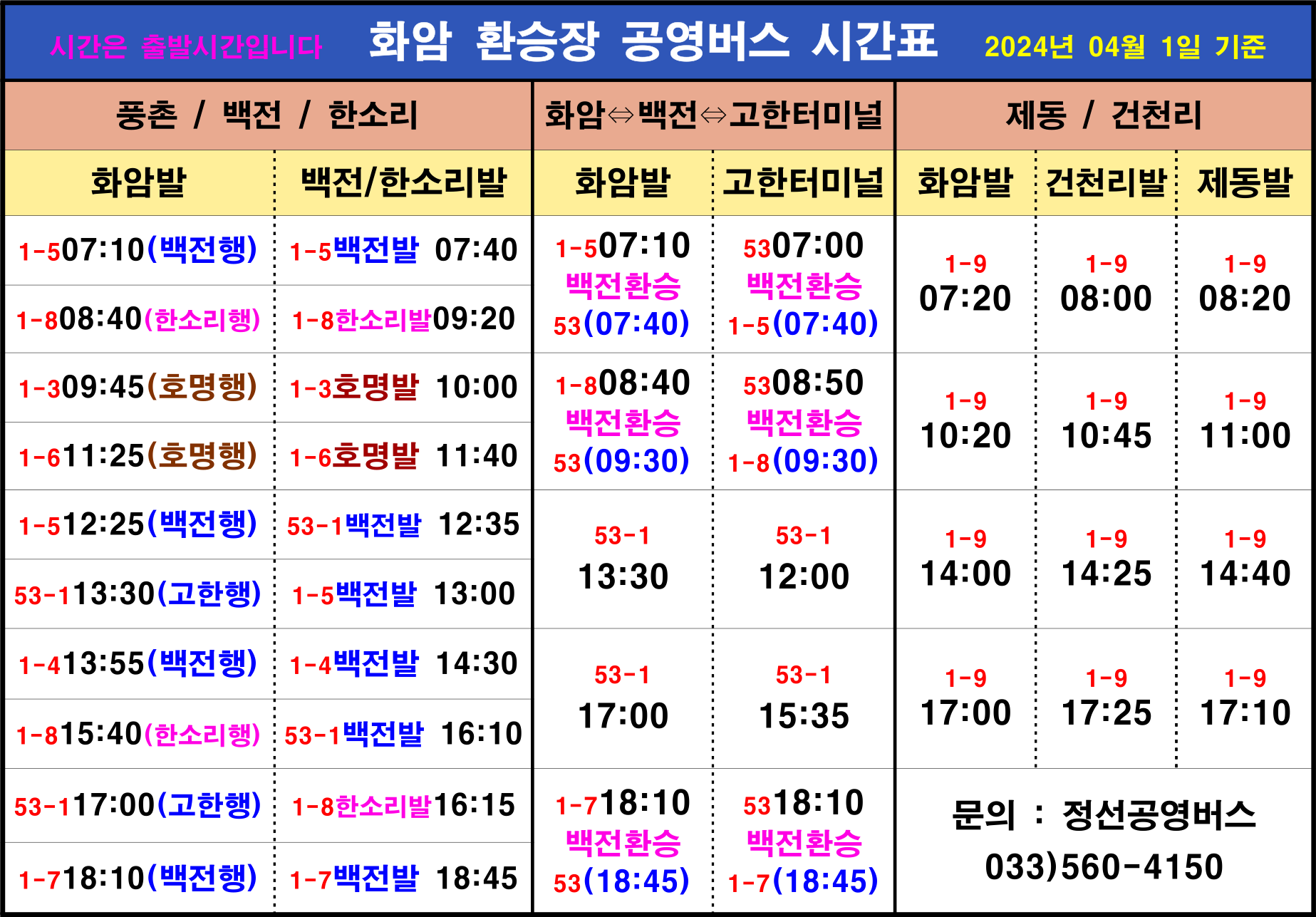 화암 환승장 공영버스 노선정보: 풍촌/백전/한소리/호명, 화암 ↔ 백전 ↔ 고한터미널, 제동/건천리