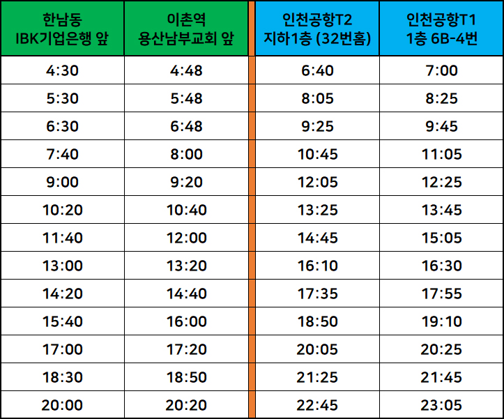 ▶ 인천공항에서 한남동 가는 시내방향 노선 출발 시간표 ↑
