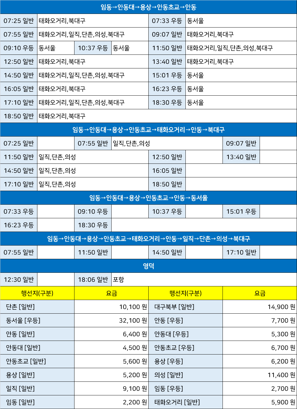 진보시외버스터미널 진보정류소 진보정류장 청송진보터미널 → "영덕,임동→안동대→용상→안동초교→안동→동서울,임동→안동대→용상→안동초교→태화오거리→안동→북대구,임동→안동대→용상→안동초교→태화오거리→안동→일직→단촌→의성→북대구,포항".