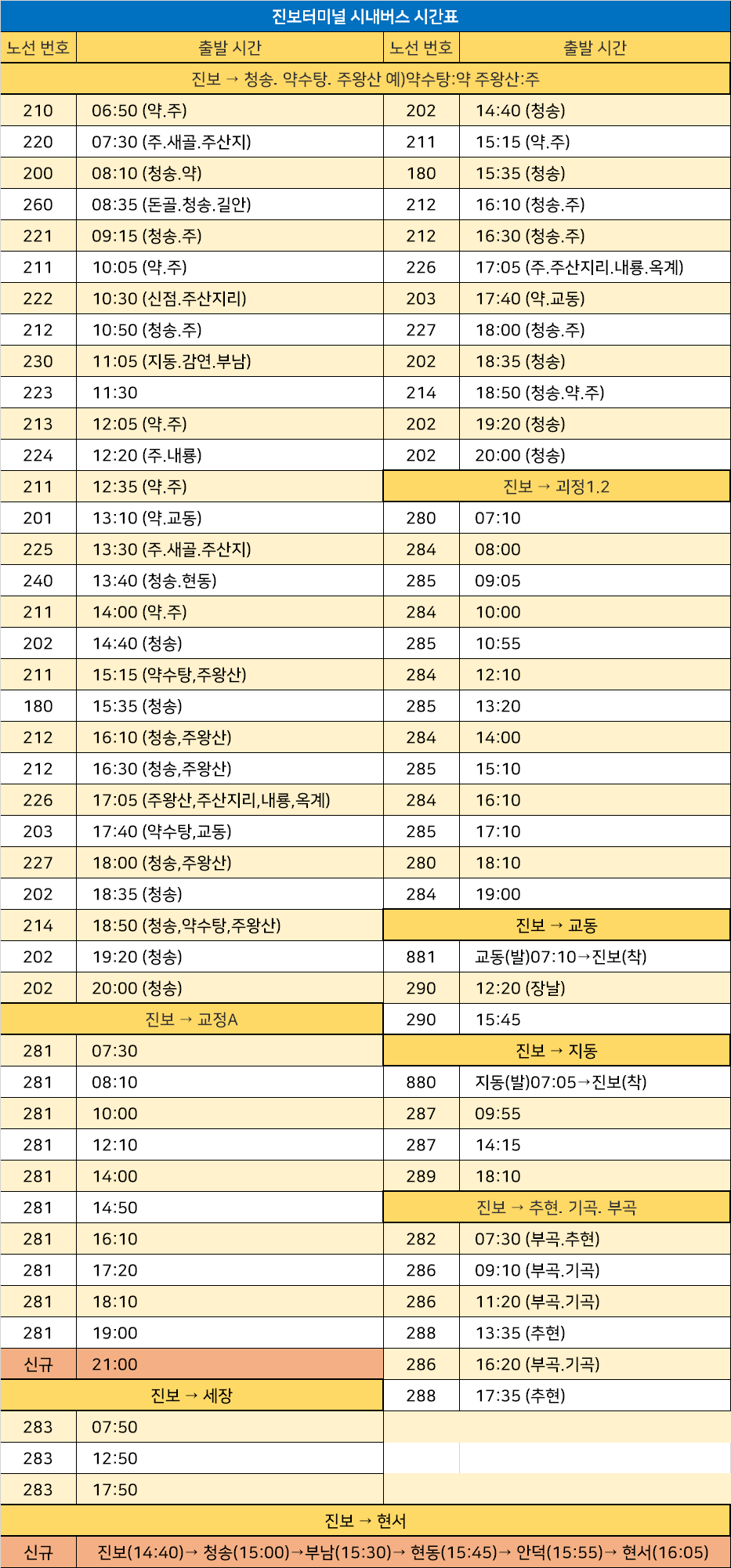 청송진보시외버스터미널 시간표/요금표 2025년 03월 22일 기준