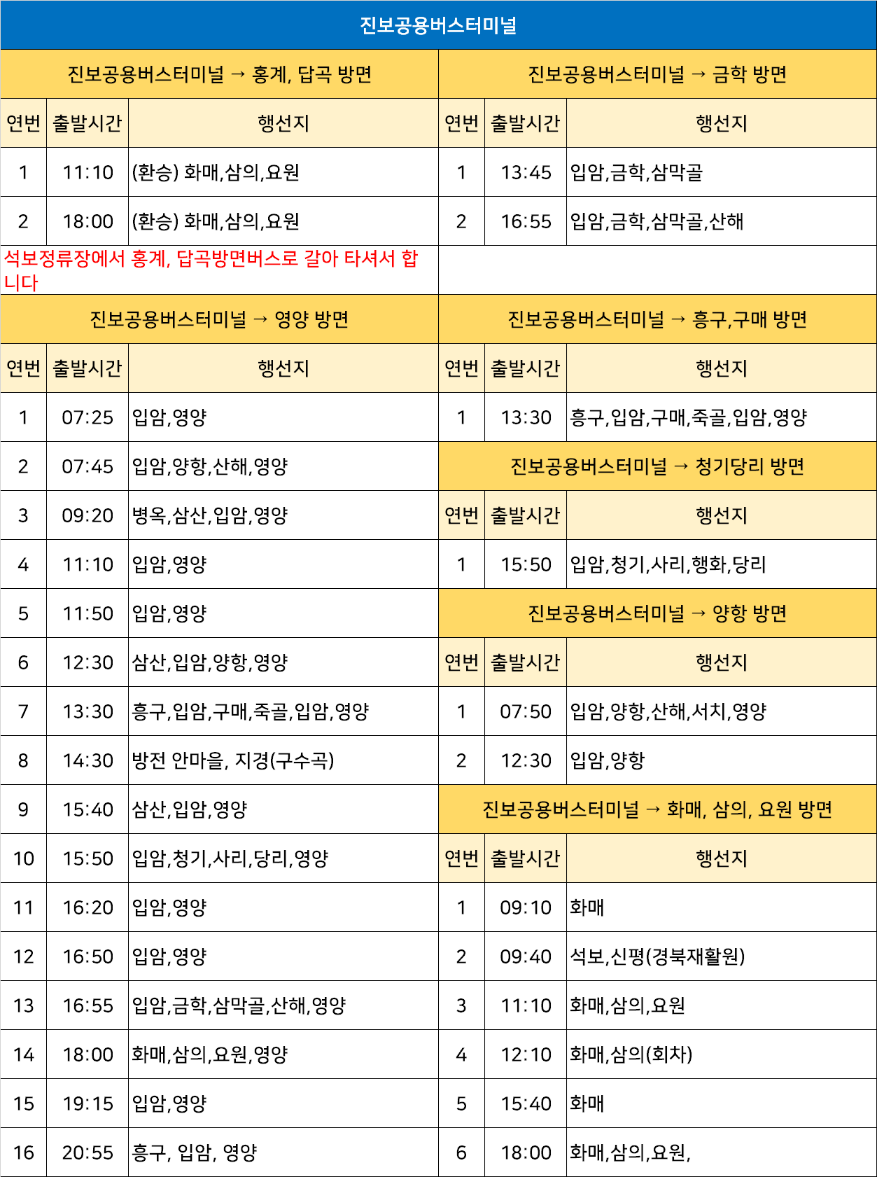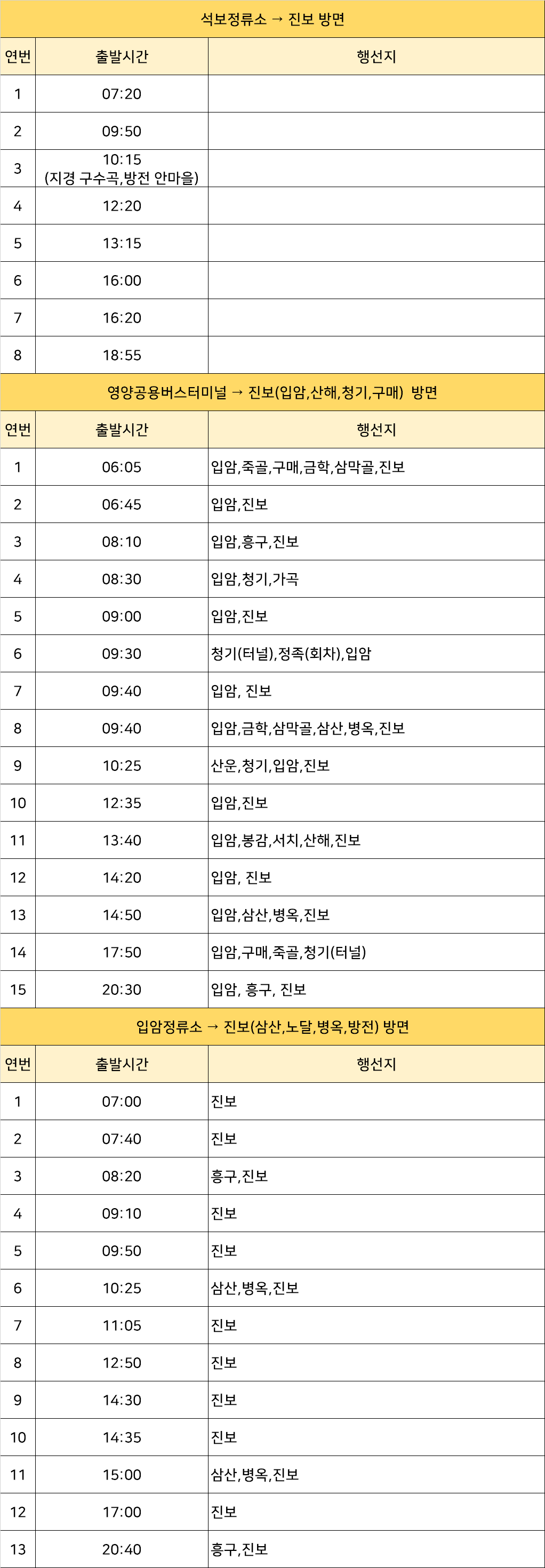 가곡, 구매, 금학, 방전 안마을, 병옥, 봉감, 산운, 산해, 삼막골, 삼산, 서치, 입암, 정족, 죽골, 지경 구수곡, 진보, 청기, 청기(터널), 흥구 석보정류소 → 진보 방면,영양공용버스터미널 → 진보(입암,산해,청기,구매) 방면,입암정류소 → 진보(삼산,노달,병옥,방전) 방면