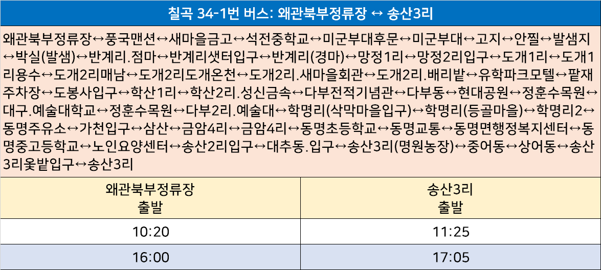칠곡 34-1번 버스: 왜관북부정류장 ↔ 송산3리