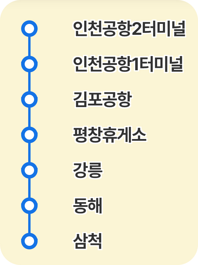 인천공항(제2터미널) ↔ 인천공항( 제1터미널 ) ↔ 김포공항 ↔ 평창휴게소 ↔ 강릉 ↔ 동해 ↔ 삼척