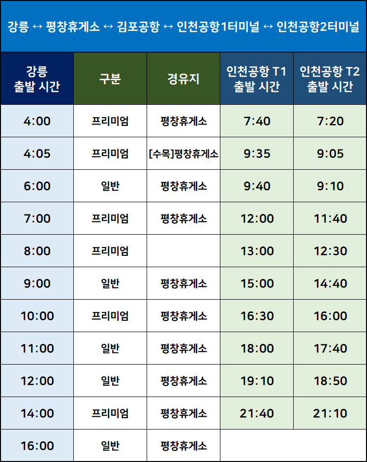 강릉시외버스터미널 → 평창휴게소 → 김포공항 → 인천공항1터미널 → 인천공항2터미널