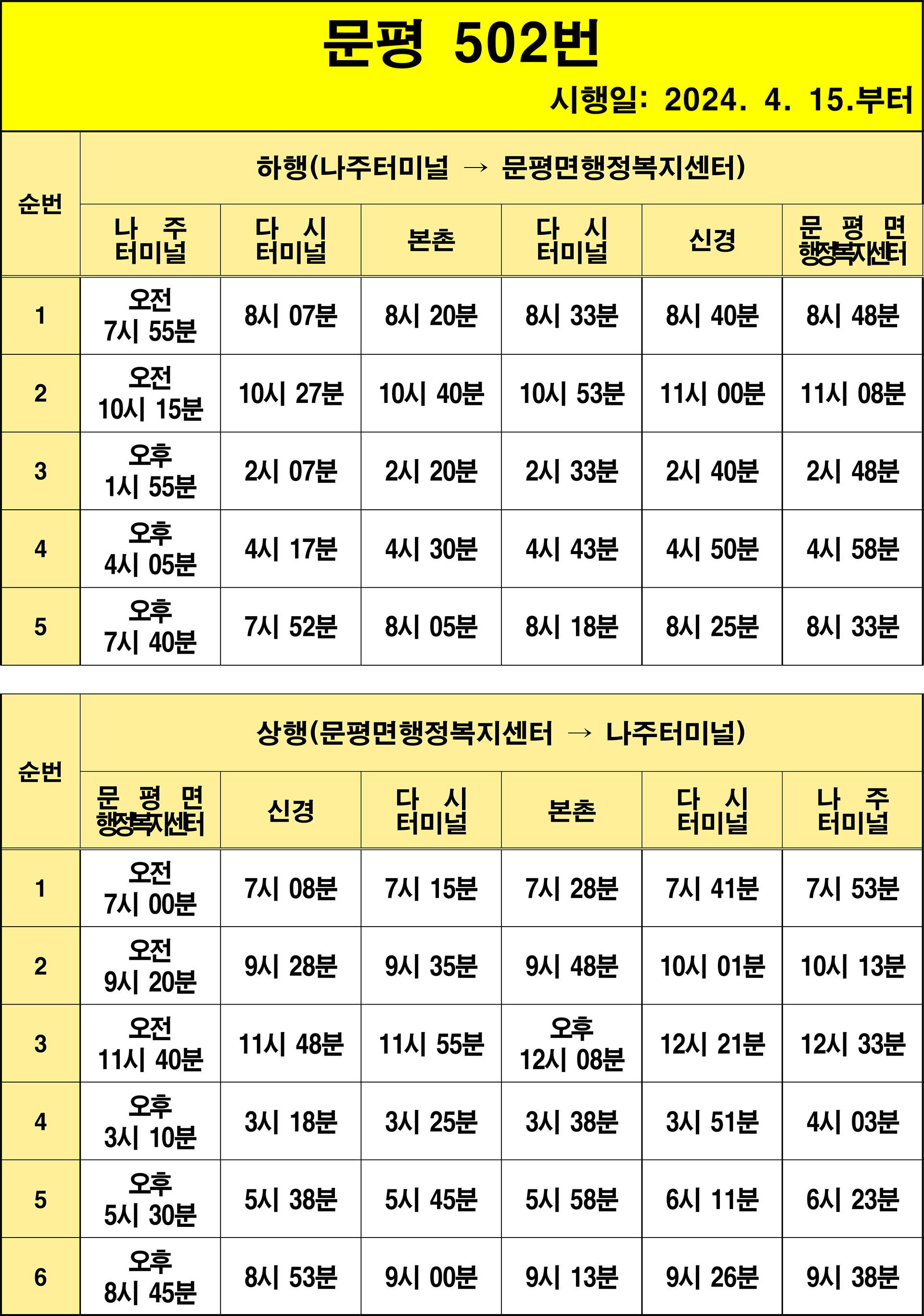 나주 502번: 1.문평면행정복지센터(기점) → 2.신안마을 → 3.동아 → 4.서원 → 5.오륜 →6.남산 → 7.금당 →8.수동 →9.신경 →10.금옥 → 11.3M → 12.현대의원 → 13.다시파출소 → 14.다시터미널 →15.다시파출소 → 16.현대의원 → 17.월성마을.동곡 → 18.동촌회관 → 19.동촌 → 20.송정 → 21.본촌종점 → 22.송정 → 23.동촌 → 24.동촌회관 –25.월성마을.동곡 → 26.현대의원 → 27.다시파출소 → 28.다시터미널 –29.원동 → 30.가동 → 31.가동마을 → 32.가운삼거리 → 33.신광리입구 → 34.용치 → 35.보현.이화영아원입구 → 36.천주교사거리 → 37.나주중앙병원 → 38.동점문입구 → 39.나주터미널(상행) → 40.나주터미널(하행) → 41.목사고을시장입구 → 42.성북아파트 → 43.천주교사거리(회차지)44.보현.이화영아원입구 → 45.용치 → 46.가운삼거리 →47.가동마을 → 48.가동 → 49.원동 → 50.다시터미널 → 51.다시파출소 → 52.현대의원 → 53.월성마을.동곡 → 54.동촌회관 → 55.동촌 → 56.송정 → 57.본촌종점 →58.송정 → 59.동촌 → 60.동촌회관 → 61.월성마을.동곡 → 62.현대의원 → 63.다시파출소 → 64.다시터미널 → 65.다시파출소 → 66.현대의원 → 67.3M → 68.신경 → 69.수동 → 70.금당 → 71.남산 → 72.오륜 → 73.서원 → 74.동아 – 75.신안마을 – 76. 문평면행정복지센터(종점)