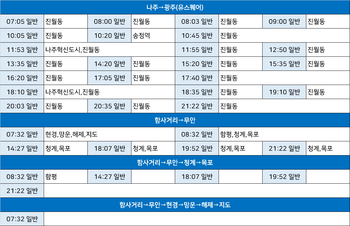 다시시외고속버스터미널 다시정류장 다시정류소 월태리터미널 → "나주→광주(유스퀘어),나주혁신도시,송정역,진월동,함사거리→무안→청계→목포,함사거리→무안→현경→망운→해제→지도,함평"..