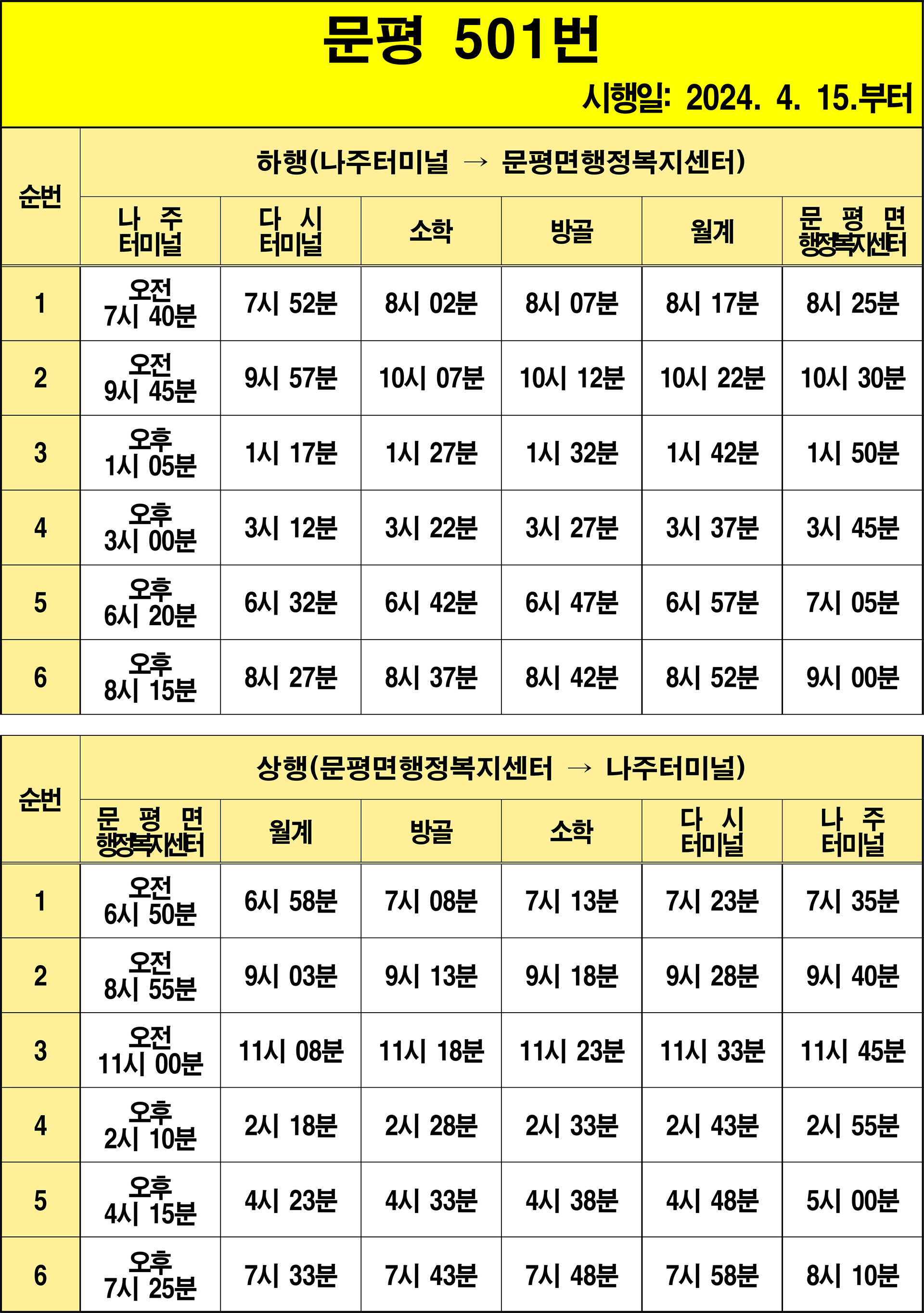 나주 501번: 1.문평면행정복지센터(기점) → 2.신안마을 → 3.동아 → 4.서원 → 5.쌍심 → 6.대장 → 7.소사 → 8.용소 → 9.입석 → 10.불로.계로보건소 → 11.만년 → 12.월계 → 13.월계마을 → 14.대족암 → 15.평전 → 16.방골.신동 → 17.방골 → 18.방골.신동 → 19.평전 → 20.소학 → 21.국동 → 22.종명 → 23.유전 → 24.청정 → 25.인동 → 26.백동저수지 → 27.백동 → 28.사구실 → 29.월명실 → 30.운암 → 31.다시터미널 → 32.원동 → 33.가동 → 34.가동마을 → 35.가운삼거리 → 36.신광리입구 → 37.용치 → 38.보현.이화영아원입구 → 39.천주교사거리 → 40.나주중앙병원 → 41.동점문입구 → 42.나주터미널(상행)(회차지) → 43.나주터미널(하행) → 44.목사고을시장입구 → 45.성북아파트 → 46.천주교사거리 → 47.보현.이화영아원입구 → 48.용치 → 49.가운삼거리 → 50.가동마을 → 51.가동 → 52.원동 → 53.다시터미널 → 54.운암 → 55.월명실 → 56.사구실 → 57.백동 → 58.백동저수지 → 59.인동 → 60.청정 → 61.유전 → 62.종명 → 63.국동 → 64.소학 → 65.평전입구 → 66.평전 → 67.방골.신동 → 68.방골 → 69.방골.신동 → 70.평전 → 71.평전입구 → 72.대족암 → 73.월계마을 → 74.월계 → 75.만년 → 76.불로.계로보건소 → 77.입석 → 78.용소 → 79.소사 → 80.대장 → 81.쌍심 → 82.서원 → 83.동아 → 84.신안마을 → 85.문평면행정복지센터(종점)