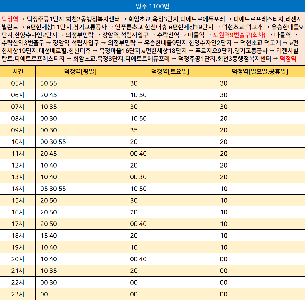양주 1100번: 덕정역 → 덕정주공1단지.회천3동행정복지센터 → 회암초교.옥정3단지.디에트르에듀포레 → 디에트르프레스티지.리젠시빌란트 → e편한세상11단지.경기교통공사 → 연푸른초교.한신더휴.e편한세상19단지 → 덕현초교.덕고개 → 유승한내들9단지.한양수자인2단지 → 의정부민락 → 장암역.석림사입구 → 수락산역 → 마들역 → 노원역9번출구(회차) → 마들역 → 수락산역3번출구 → 장암역.석림사입구 → 의정부민락 → 유승한내들9단지.한양수자인2단지 → 덕현초교.덕고개 → e편한세상19단지.대성베르힐.한신더휴 → 옥정마을16단지.e편한세상18단지 → 푸르지오9단지.경기교통공사 → 리젠시빌란트.디에트르프레스티지 → 회암초교.옥정3단지.디에트르에듀포레 → 덕정주공1단지.회천3동행정복지센터 → 덕정역