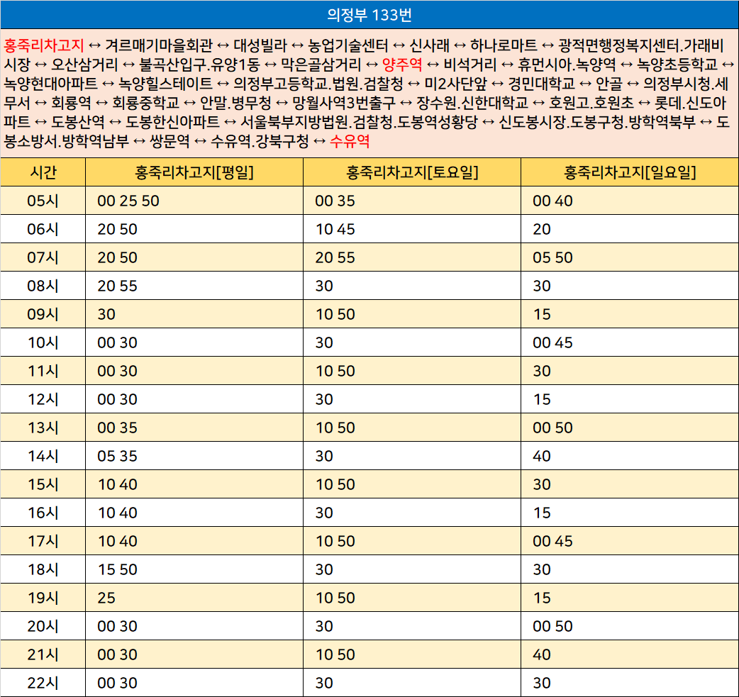 홍죽리차고지 → 고말재 → 두라푸드 → 홍죽산단근린공원 → 냅떼 → 신양주모아엘가니케 → 단촌삼거리 → 조광주유소 → 겨르매기 → 한승미르빌A → 문예회관 → 대성빌라 → 농업기술센터 → 광석1리 → 희망A → 신사래 → 하나로마트 → 광적면행정복지센터 → 가래비시장 → 가납사거리 → 양주테크노시티 → 진웅산업 → 능안말 → 능안공단 → 방성5리 → 8사단사령부 → 고릉말 → 무태안 → 오산삼거리 → 유양공단 → 불곡산입구 → 유양초 → 양주향교 → 국군복지단경기북부지원본부 → 막은골삼거리 → 양주시청 → 양주역 → 비석거리 → 휴먼시아단지 → 녹양초 → 녹양현대A → 녹양힐스테이트A앞 → 의정부고.법원.검찰청 → 미2사단앞 → 경민대학 → 안골.롯데캐슬골드포레 → 흥선브라운스톤.더샵파크에비뉴A → 흥선청소년센터.흥선교앞 → 의정부시청.세무서 → 의정부시의회.정보도서관 → 의정부예술의전당 → 범골입구.상우고 → 롯데캐슬골드파크A.동화A → 삼성교회 → 호원가든A → 한신A → 회룡역 → 호원동.한주A → 회룡중학교 → 안말.병무청.호원예비군훈련장 → 망월사역3번 → 장수원.신한대 → 호원고교.호암초교 → 롯데.신도A → 다락원.서울도솔학교앞 → 도봉산역(중) → 도봉한신A(중) → 서울북부지방법원.검찰청.도봉역성황당(중) → 신도봉사거리(중) → 신도봉시장.도봉구청.방학역북부(중) → 도봉소방서.방학역남부(중) → 도봉보건소(중) → 도봉구민회관.도봉문화원(중) → 쌍문역(중) → 우이1교앞(중) → 수유3동우체국(중) → 수유역.강북구청(중) → 수유역(중) 회차 → 수유역.강북구청(중) → 수유3동우체국(중) → 우이1교앞(중) → 쌍문역(중) → 도봉구민회관.도봉문화원(중) → 도봉보건소.북한산아이파크A(중) → 도봉소방서.방학역남부(중) → 신도봉시장.도봉구청.방학역북부(중) → 신도봉사거리(중) → 서울북부지방법원.검찰청.도봉역성황당(중) → 도봉한신A(중) → 도봉산역(중) → 다락원.서울도솔학교앞 → 롯데.신도A → 호원고교.호암초교 → 장수원.신한대 → 그랑베르A → 안말.병무청.호원예비군훈련장앞 → 회룡중 → 자동차검사소.한주A → 호원동.한주A → 회룡역 → 한신A → 호원가든A → 삼성교회 → 동화A.롯데캐슬골드파크A → 범골입구.상우고 → 의정부청소년수련관 → 의정부시청 → 의정부시청.세무서 → 흥선청소년센터.흥선교앞 → 흥선브라운스톤.더샵파크에비뉴A → 안골.롯데캐슬골드포레 → 경민대학 → 미2사단앞 → 금광포란재이너스A → 의정부고.법원.검찰청 → 녹양힐스테이트A앞 → 녹양현대A → 녹양초.녹양종합사회복지관 → 휴먼시아단지 → 비석거리 → 양주역 → 양주시청.양주고용복지플러스센터 → 막은골삼거리 → 국군복지단경기북부지원본부 → 양주향교.양주별산대놀이전수회관 → 유양초 → 불곡산입구.유양1동 → 유양공단 → 오산삼거리 → 무태안.대교A → 고릉말 → 8사단사령부.신촌동이마을 → 방성5리 → 능안공단 → 능안말 → 진웅산업 → 양주테크노시티 → 가납사거리 → 가래비주유소 → 양주신협본점 → 광적면행정복지센터.가래비시장 → 하나로마트 → 신사래.조양빌라.형제빌라 → 희망A → 광석1리회관 → 농업기술센터 → 대성빌라 → 문예회관.안전교육관 → 한승미르빌A → 겨르매기회관 → 조광주유소 → 단촌삼거리 → 신양주모아엘가니케 → 냅떼 → 홍죽산단근린공원 → 두라푸드 → 홍죽산업단지 → 홍죽리차고지
