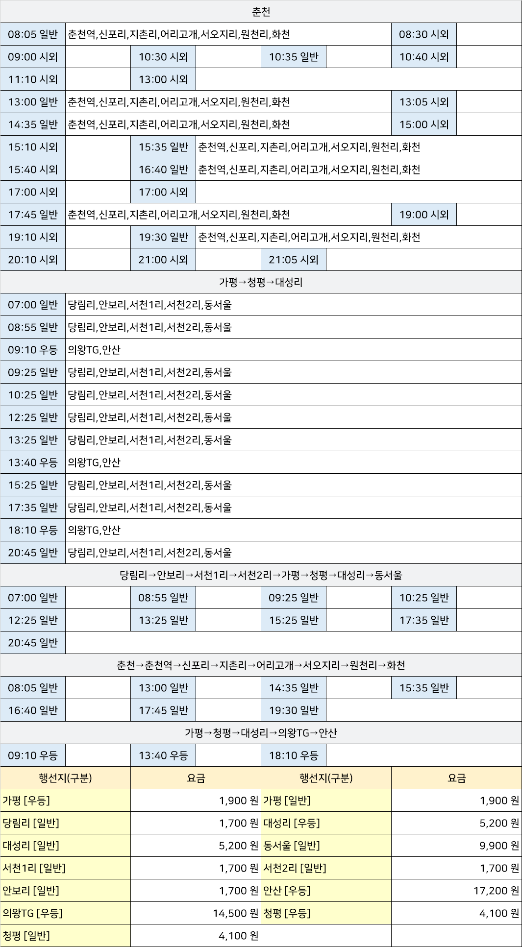 강촌시외고속버스터미널 시간표/요금표 2025년 05월 03일 기준