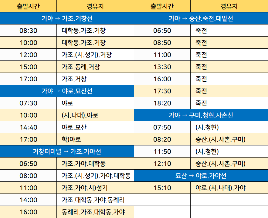 가야 → 가조.거창선, 가야 → 야로.묘산선, 거창터미널 → 가조.가야선, 가야 → 숭산.죽전.대밭선, 가야 → 구미.청현.사촌선, 묘산 → 야로.가야선, 대학동, 동례, 성기, 동례리, 숭산, 나대