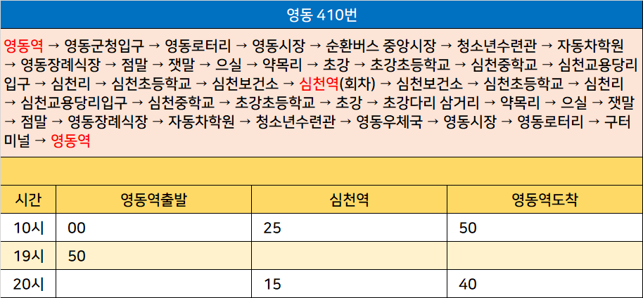 영동 410번: 영동역 → 영동군청입구 → 영동로터리 → 영동시장 → 순환버스 중앙시장 → 청소년수련관 → 자동차학원 → 영동장례식장 → 점말 → 잿말 → 으실 → 약목리 → 초강 → 초강초등학교 → 심천중학교 → 심천교용당리입구 → 심천리 → 심천초등학교 → 심천보건소 → 심천역(회차) → 심천보건소 → 심천초등학교 → 심천리 → 심천교용당리입구 → 심천중학교 → 초강초등학교 → 초강 → 초강다리 삼거리 → 약목리 → 으실 → 잿말 → 점말 → 영동장례식장 → 자동차학원 → 청소년수련관 → 영동우체국 → 영동시장 → 영동로터리 → 구터미널 → 영동역