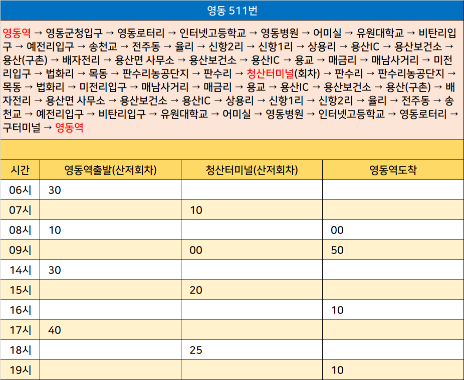 영동 511번: 영동역 → 영동군청입구 → 영동로터리 → 인터넷고등학교 → 영동병원 → 어미실 → 유원대학교 → 비탄리입구 → 예전리입구 → 송천교 → 전주동 → 율리 → 신항2리 → 신항1리 → 상용리 → 용산IC → 용산보건소 → 용산(구촌) → 배자전리 → 용산면 사무소 → 용산보건소 → 용산IC → 용교 → 매금리 → 매남사거리 → 미전리입구 → 법화리 → 목동 → 판수리농공단지 → 판수리 → 청산터미널(회차) → 판수리 → 판수리농공단지 → 목동 → 법화리 → 미전리입구 → 매남사거리 → 매금리 → 용교 → 용산IC → 용산보건소 → 용산(구촌) → 배자전리 → 용산면 사무소 → 용산보건소 → 용산IC → 상용리 → 신항1리 → 신항2리 → 율리 → 전주동 → 송천교 → 예전리입구 → 비탄리입구 → 유원대학교 → 어미실 → 영동병원 → 인터넷고등학교 → 영동로터리 → 구터미널 → 영동역