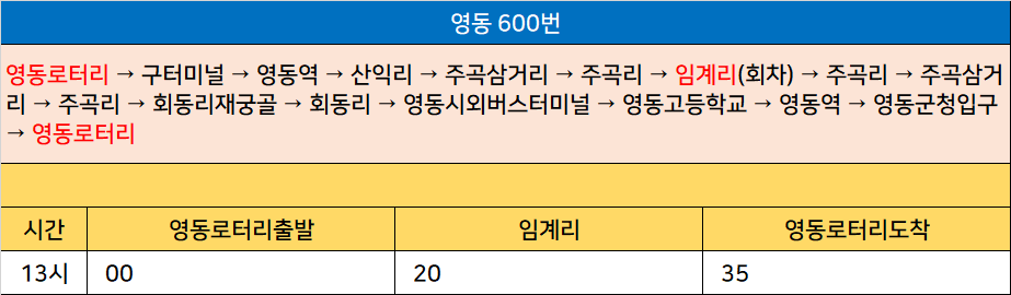 영동 600번: 영동로터리 → 구터미널 → 영동역 → 산익리 → 주곡삼거리 → 주곡리 → 임계리(회차) → 주곡리 → 주곡삼거리 → 주곡리 → 회동리재궁골 → 회동리 → 영동시외버스터미널 → 영동고등학교 → 영동역 → 영동군청입구 → 영동로터리