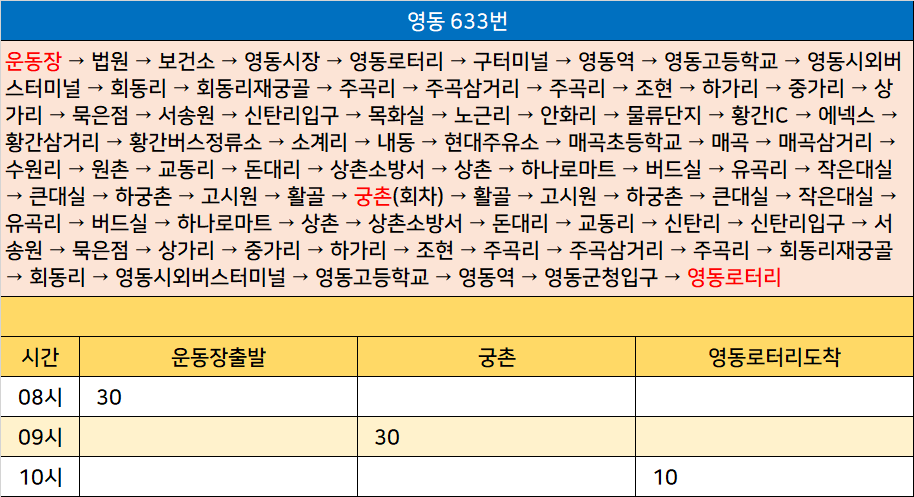 영동 633번: 운동장 → 법원 → 보건소 → 영동시장 → 영동로터리 → 구터미널 → 영동역 → 영동고등학교 → 영동시외버스터미널 → 회동리 → 회동리재궁골 → 주곡리 → 주곡삼거리 → 주곡리 → 조현 → 하가리 → 중가리 → 상가리 → 묵은점 → 서송원 → 신탄리입구 → 목화실 → 노근리 → 안화리 → 물류단지 → 황간IC → 에넥스 → 황간삼거리 → 황간버스정류소 → 소계리 → 내동 → 현대주유소 → 매곡초등학교 → 매곡 → 매곡삼거리 → 수원리 → 원촌 → 교동리 → 돈대리 → 상촌소방서 → 상촌 → 하나로마트 → 버드실 → 유곡리 → 작은대실 → 큰대실 → 하궁촌 → 고시원 → 활골 → 궁촌(회차) → 활골 → 고시원 → 하궁촌 → 큰대실 → 작은대실 → 유곡리 → 버드실 → 하나로마트 → 상촌 → 상촌소방서 → 돈대리 → 교동리 → 신탄리 → 신탄리입구 → 서송원 → 묵은점 → 상가리 → 중가리 → 하가리 → 조현 → 주곡리 → 주곡삼거리 → 주곡리 → 회동리재궁골 → 회동리 → 영동시외버스터미널 → 영동고등학교 → 영동역 → 영동군청입구 → 영동로터리