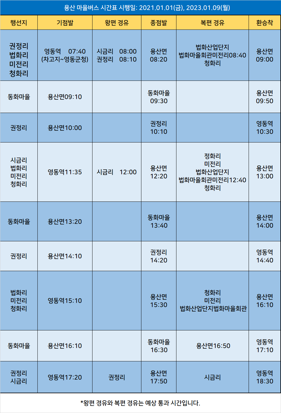 영동 510번: 영동역 → 영동군청입구 → 영동로터리 → 인터넷고등학교 → 영동병원 → 어미실 → 유원대학교 → 비탄리입구 → 예전리입구 → 송천교 → 전주동 → 율리 → 신항리 → 배자전리 → 용산면 사무소 → 용산보건소 → 용산IC → 용교 → 매금리 → 매남사거리 → 미전리입구 → 법화리 → 목동 → 판수리농공단지 → 판수리 → 청산터미널(회차) → 판수리 → 판수리농공단지 → 목동 → 법화리 → 미전리입구 → 매남사거리 → 매금리 → 용교 → 용산IC → 용산보건소 → 용산(구촌) → 배자전리 → 신항리 → 율리 → 전주동 → 송천교 → 예전리입구 → 비탄리입구 → 유원대학교 → 어미실 → 영동병원 → 인터넷고등학교 → 영동로터리 → 구터미널 → 영동역