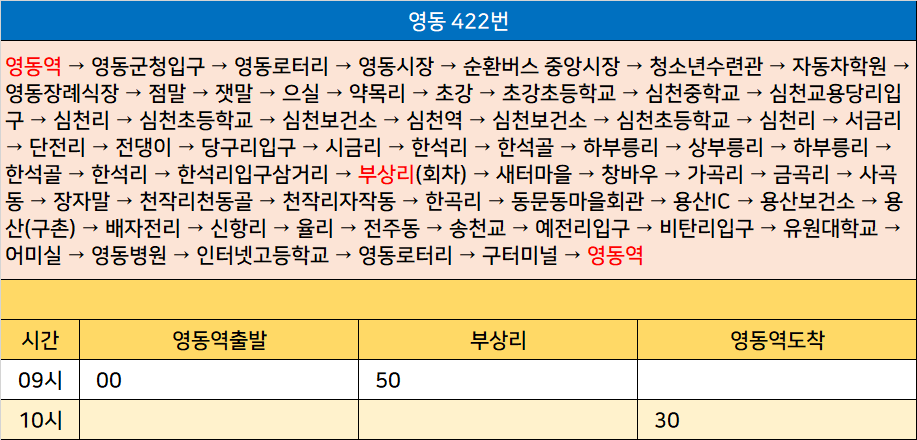 영동 422번: 영동역 → 영동군청입구 → 영동로터리 → 영동시장 → 순환버스 중앙시장 → 청소년수련관 → 자동차학원 → 영동장례식장 → 점말 → 잿말 → 으실 → 약목리 → 초강 → 초강초등학교 → 심천중학교 → 심천교용당리입구 → 심천리 → 심천초등학교 → 심천보건소 → 심천역 → 심천보건소 → 심천초등학교 → 심천리 → 서금리 → 단전리 → 전댕이 → 당구리입구 → 시금리 → 한석리 → 한석골 → 하부릉리 → 상부릉리 → 하부릉리 → 한석골 → 한석리 → 한석리입구삼거리 → 부상리(회차) → 새터마을 → 창바우 → 가곡리 → 금곡리 → 사곡동 → 장자말 → 천작리천동골 → 천작리자작동 → 한곡리 → 동문동마을회관 → 용산IC → 용산보건소 → 용산(구촌) → 배자전리 → 신항리 → 율리 → 전주동 → 송천교 → 예전리입구 → 비탄리입구 → 유원대학교 → 어미실 → 영동병원 → 인터넷고등학교 → 영동로터리 → 구터미널 → 영동역