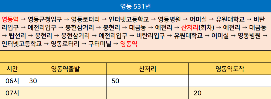 영동 531번: 영동역 → 영동군청입구 → 영동로터리 → 인터넷고등학교 → 영동병원 → 어미실 → 유원대학교 → 비탄리입구 → 예전리입구 → 봉현삼거리 → 봉현리 → 대금동 → 예전리 → 산저리(회차) → 예전리 → 대금동 → 탑선리 → 봉현리 → 봉현삼거리 → 예전리입구 → 비탄리입구 → 유원대학교 → 어미실 → 영동병원 → 인터넷고등학교 → 영동로터리 → 구터미널 → 영동역