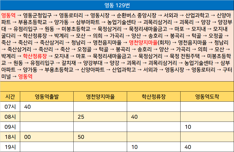 영동 129번: 영동역 → 영동군청입구 → 영동로터리 → 영동시장 → 순환버스 중앙시장 → 서외과 → 산업과학고 → 신양아파트 → 부용초등학교 → 양가동 → 삼부아파트 → 농업기술센타 → 괴목리삼거리 → 괴목리 → 양강 → 양강부대 → 유점리입구 → 원동 → 미봉초등학교 → 묵정삼거리 → 묵정리새마을금고 → 마포 → 모지내 → 모지내 굴다리 → 학산정류장 → 박계리 → 모산 → 의희 → 가곡리 → 양산 → 송호리 → 봉곡리 → 턱골 → 오정골 → 죽산 → 죽산리 → 죽산삼거리 → 청남리 → 명천음지마을 → 명천양지마을(회차) → 명천음지마을 → 청남리 → 죽산삼거리 → 죽산리 → 죽산 → 오정골 → 턱골 → 봉곡리 → 송호리 → 양산 → 가곡리 → 의희 → 모산 → 박계리 → 학산정류장 → 모지내 → 마포 → 묵정리새마을금고 → 묵정삼거리 → 묵정 전원주택 → 미봉초등학교 → 원동 → 유점리입구 → 갈치재 → 양강부대 → 양강 → 괴목리 → 괴목리삼거리 → 농업기술센타 → 삼부아파트 → 양가동 → 부용초등학교 → 신양아파트 → 산업과학고 → 서외과 → 영동시장 → 영동로터리 → 구터미널 → 영동역