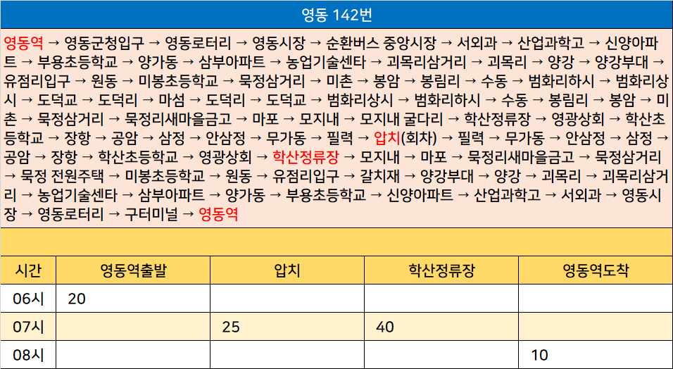영동 142번: 영동역 → 영동군청입구 → 영동로터리 → 영동시장 → 순환버스 중앙시장 → 서외과 → 산업과학고 → 신양아파트 → 부용초등학교 → 양가동 → 삼부아파트 → 농업기술센타 → 괴목리삼거리 → 괴목리 → 양강 → 양강부대 → 유점리입구 → 원동 → 미봉초등학교 → 묵정삼거리 → 미촌 → 봉암 → 봉림리 → 수동 → 범화리하시 → 범화리상시 → 도덕교 → 도덕리 → 마섬 → 도덕리 → 도덕교 → 범화리상시 → 범화리하시 → 수동 → 봉림리 → 봉암 → 미촌 → 묵정삼거리 → 묵정리새마을금고 → 마포 → 모지내 → 모지내 굴다리 → 학산정류장 → 영광상회 → 학산초등학교 → 장항 → 공암 → 삼정 → 안삼정 → 무가동 → 필력 → 압치(회차) → 필력 → 무가동 → 안삼정 → 삼정 → 공암 → 장항 → 학산초등학교 → 영광상회 → 학산정류장 → 모지내 → 마포 → 묵정리새마을금고 → 묵정삼거리 → 묵정 전원주택 → 미봉초등학교 → 원동 → 유점리입구 → 갈치재 → 양강부대 → 양강 → 괴목리 → 괴목리삼거리 → 농업기술센타 → 삼부아파트 → 양가동 → 부용초등학교 → 신양아파트 → 산업과학고 → 서외과 → 영동시장 → 영동로터리 → 구터미널 → 영동역