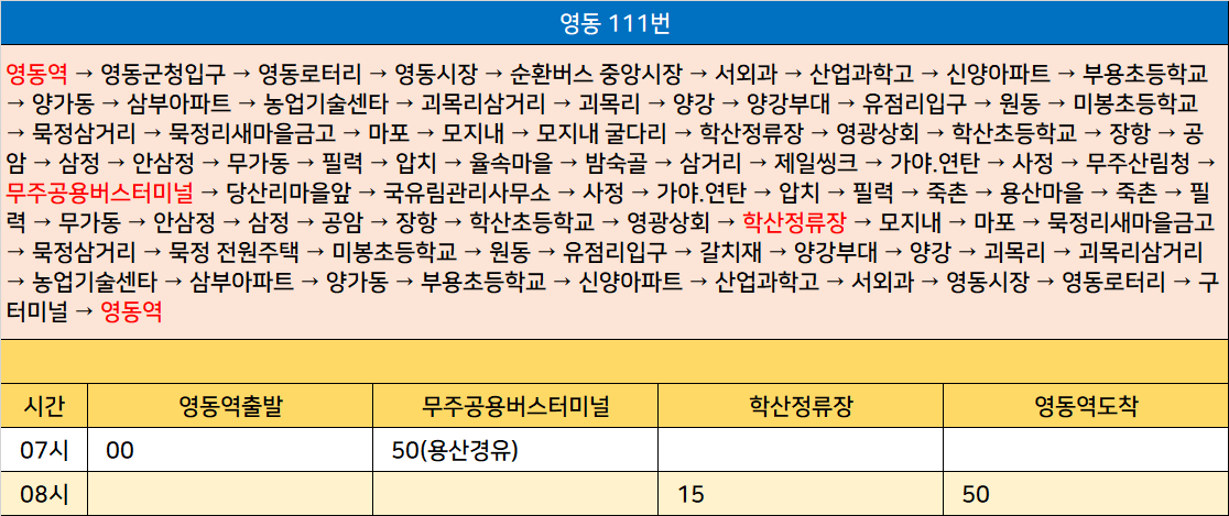 영동 111번: 영동역 → 영동군청입구 → 영동로터리 → 영동시장 → 순환버스 중앙시장 → 서외과 → 산업과학고 → 신양아파트 → 부용초등학교 → 양가동 → 삼부아파트 → 농업기술센타 → 괴목리삼거리 → 괴목리 → 양강 → 양강부대 → 유점리입구 → 원동 → 미봉초등학교 → 묵정삼거리 → 묵정리새마을금고 → 마포 → 모지내 → 모지내 굴다리 → 학산정류장 → 영광상회 → 학산초등학교 → 장항 → 공암 → 삼정 → 안삼정 → 무가동 → 필력 → 압치 → 율속마을 → 밤숙골 → 삼거리 → 제일씽크 → 가야.연탄 → 사정 → 무주산림청 → 무주공용버스터미널 → 당산리마을앞 → 국유림관리사무소 → 사정 → 가야.연탄 → 압치 → 필력 → 죽촌 → 용산마을 → 죽촌 → 필력 → 무가동 → 안삼정 → 삼정 → 공암 → 장항 → 학산초등학교 → 영광상회 → 학산정류장 → 모지내 → 마포 → 묵정리새마을금고 → 묵정삼거리 → 묵정 전원주택 → 미봉초등학교 → 원동 → 유점리입구 → 갈치재 → 양강부대 → 양강 → 괴목리 → 괴목리삼거리 → 농업기술센타 → 삼부아파트 → 양가동 → 부용초등학교 → 신양아파트 → 산업과학고 → 서외과 → 영동시장 → 영동로터리 → 구터미널 → 영동역