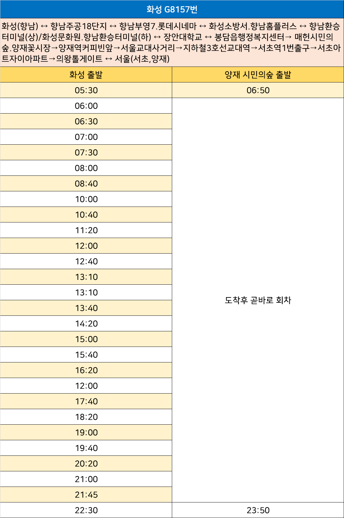 화성 직행좌석버스 G8157번: 화성(향남) ↔ 향남주공18단지 ↔ 향남부영7.롯데시네마 ↔ 화성소방서.향남홈플러스 ↔ 향남환승터미널(상)/화성문화원.향남환승터미널(하) ↔ 장안대학교 ↔ 봉담읍행정복지센터 → 매헌시민의숲.양재꽃시장→ 양재역커피빈앞 → 서울교대사거리 → 지하철3호선교대역 → 서초역1번출구 → 서초아트자이아파트→의왕톨게이트 ↔ 서울(서초,양재)