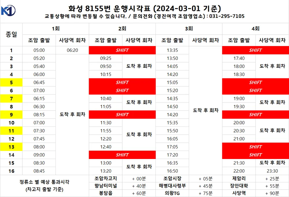 향남 시외버스 터미널 시간표/요금표 2025년 03월 11일 기준