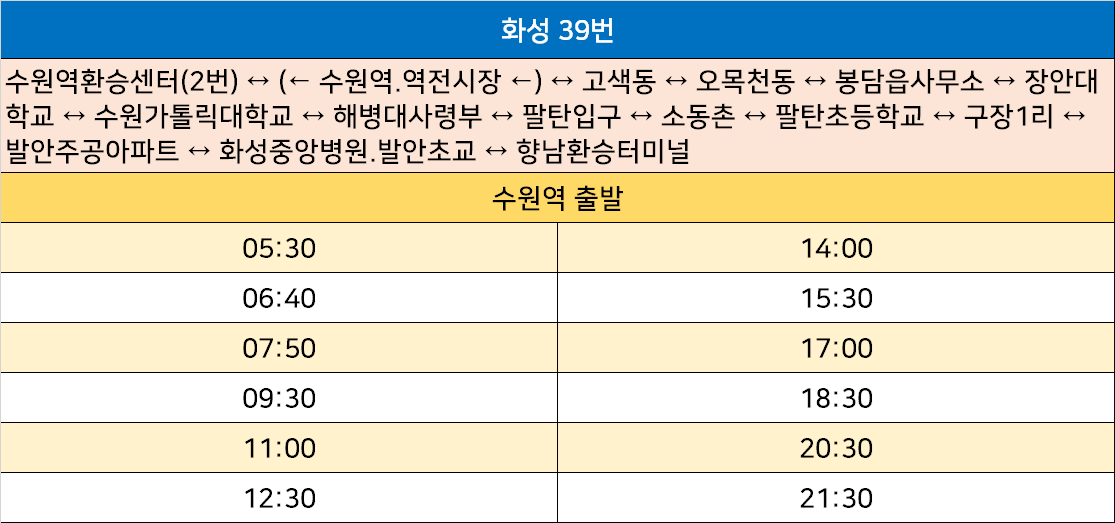 화성 39번: 수원역환승센터(2번) ↔ (← 수원역.역전시장 ←) ↔ 고색동 ↔ 오목천동 ↔ 봉담읍사무소 ↔ 장안대학교 ↔ 수원가톨릭대학교 ↔ 해병대사령부 ↔ 팔탄입구 ↔ 소동촌 ↔ 팔탄초등학교 ↔ 구장1리 ↔ 발안주공아파트 ↔ 화성중앙병원.발안초교 ↔ 향남환승터미널