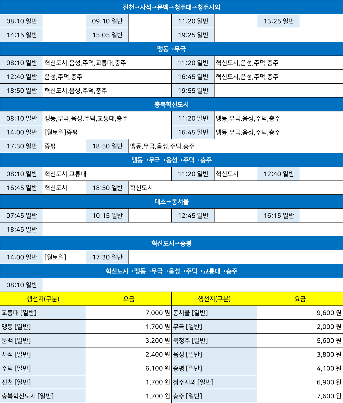 덕산진천시외고속버스터미널 덕산진천정류소 덕산진천정류장 → "대소→동서울,맹동→무극→음성→주덕→충주,진천→사석→문백→청주대→청주시외,충북혁신도시,혁신도시→맹동→무극→음성→주덕→교통대→충주,혁신도시→증평".