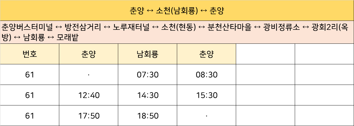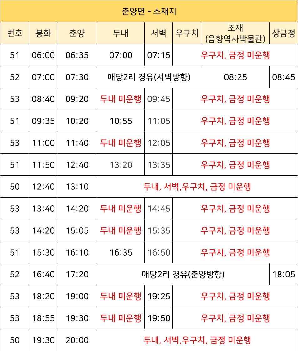 춘양 ↔ 소천(남회룡) ↔ 춘양 버스: