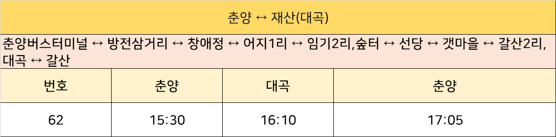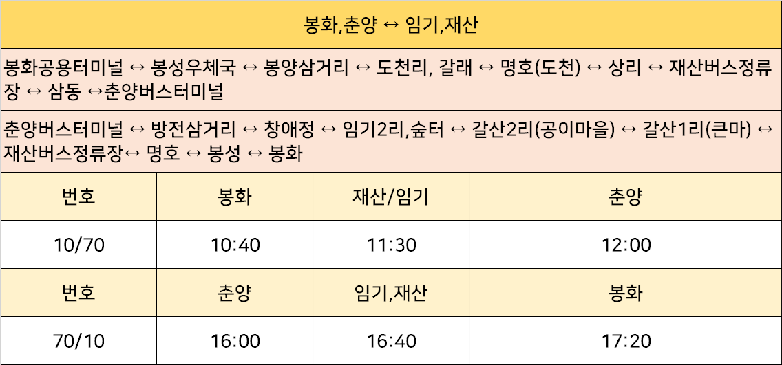 춘양버스터미널 ↔ 방전삼거리 ↔창애정 ↔ 어지1리 ↔ 임기2리,숲터 ↔ 선당 ↔ 갯마을 ↔ 갈산2리,대곡 ↔ 갈산 ↔ 우련전 → 봉화공용버스터미널