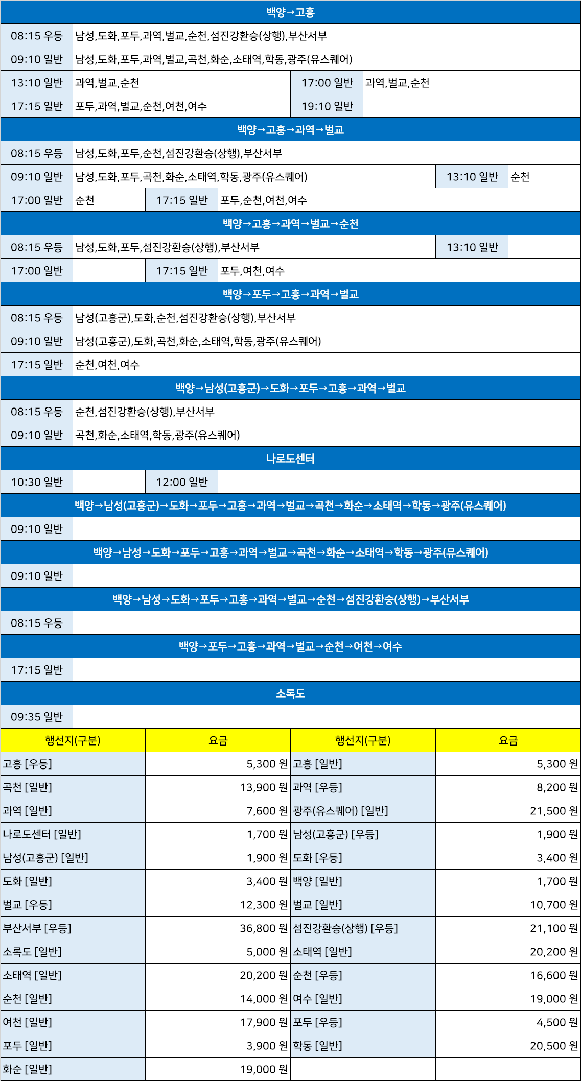 나로도공용시외고속버스터미널 나로도정류장 나로도정류소 → "나로도센터,백양→고흥→과역→벌교→순천,백양→남성(고흥군)→도화→포두→고흥→과역→벌교→곡천→화순→소태역→학동→광주(유스퀘어),백양→남성→도화→포두→고흥→과역→벌교→곡천→화순→소태역→학동→광주(유스퀘어),백양→남성→도화→포두→고흥→과역→벌교→순천→섬진강환승(상행)→부산서부,백양→포두→고흥→과역→벌교→순천→여천→여수,소록도".
