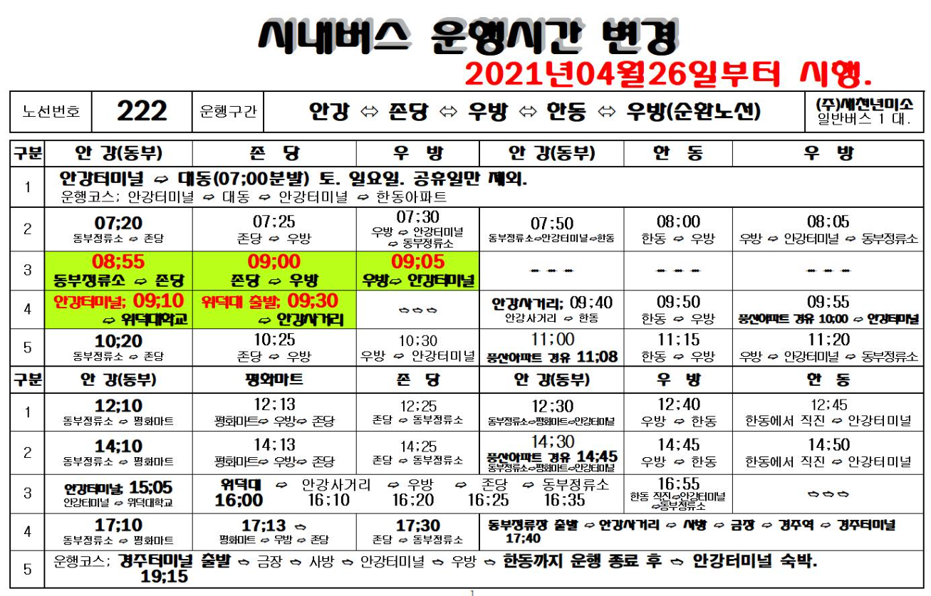 안강동부 시외버스 정류장 시간표/요금표 2025년 09월 15일 기준