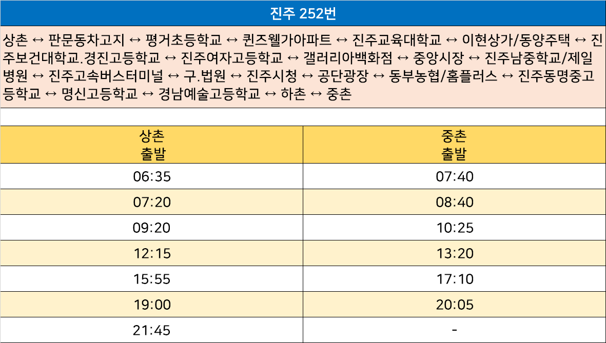 진주 252번: 상촌 ↔ 판문동차고지 ↔ 평거초등학교 ↔ 퀸즈웰가아파트 ↔ 진주교육대학교 ↔ 이현상가/동양주택 ↔ 진주보건대학교.경진고등학교 ↔ 진주여자고등학교 ↔ 갤러리아백화점 ↔ 중앙시장 ↔ 진주남중학교/제일병원 ↔ 진주고속버스터미널 ↔ 구.법원 ↔ 진주시청 ↔ 공단광장 ↔ 동부농협/홈플러스 ↔ 진주동명중고등학교 ↔ 명신고등학교 ↔ 경남예술고등학교 ↔ 하촌 ↔ 중촌