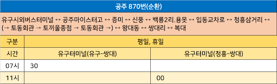 공주 870번: 유구시외버스터미널 ↔ 공주마이스터고 ↔ 증미 ↔ 신풍 ↔ 백룡2리.용못 ↔ 입동교차로 ↔ 청흥삼거리 ↔ (→ 토동회관 → 토끼울종점 → 토동회관 →) ↔ 왕대동 ↔ 쌍대리 ↔ 복대