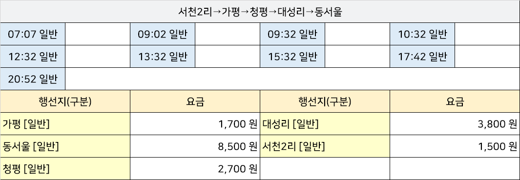 서천1리시외고속버스터미널 서천1리정류장 서천1리정류소 → "서천2리→가평→청평→대성리→동서울".