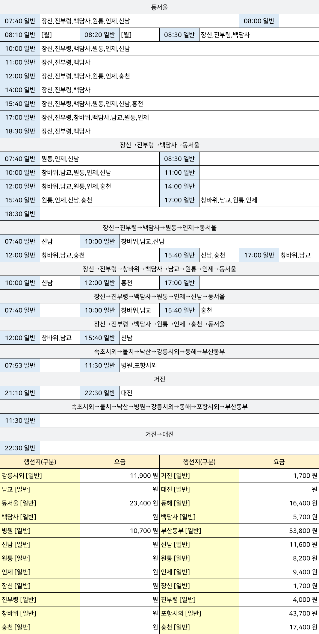 간성 시외버스 터미널 시간표/요금표 2025년 05월 17일 기준
