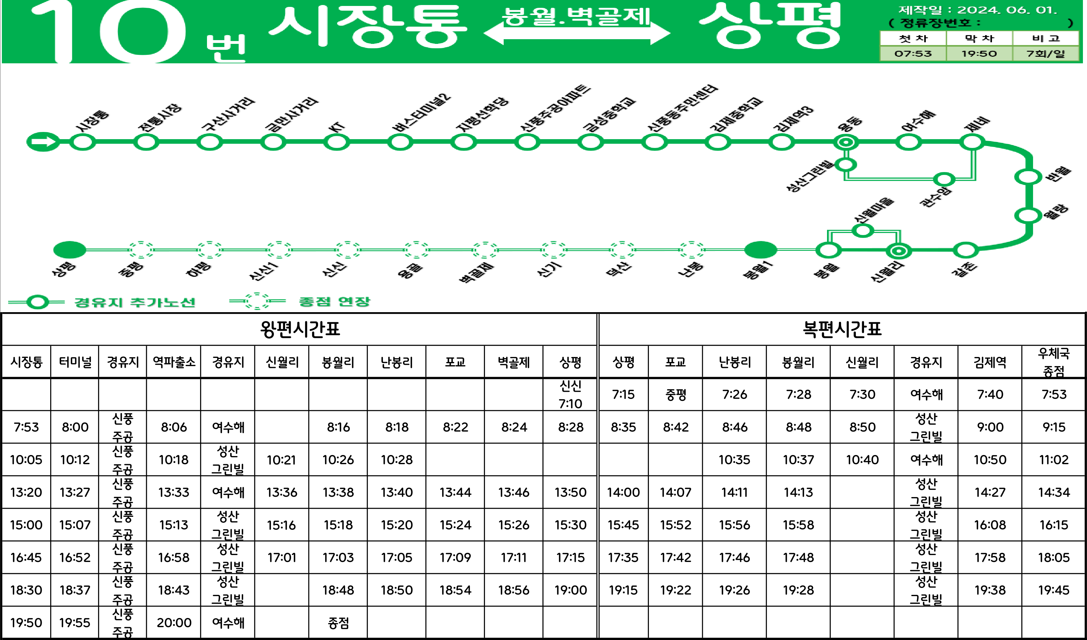 김제 10번: 시장통 ↔ (→ 구산사거리 → 김제공용버스터미널 → 신풍주공아파트 →/← 김제우체국 ← 전화국 ← 시립도서관 ←) ↔ 김제역 ↔ (성산그린빌/여수해) ↔ 제네 ↔ 반월 ↔ 월랑 ↔ 신월 ↔ (신월회관 ↔ 신월) ↔ 봉월 ↔ 난봉 ↔ 포교 ↔ 벽골제 ↔ 신신 ↔ 상평