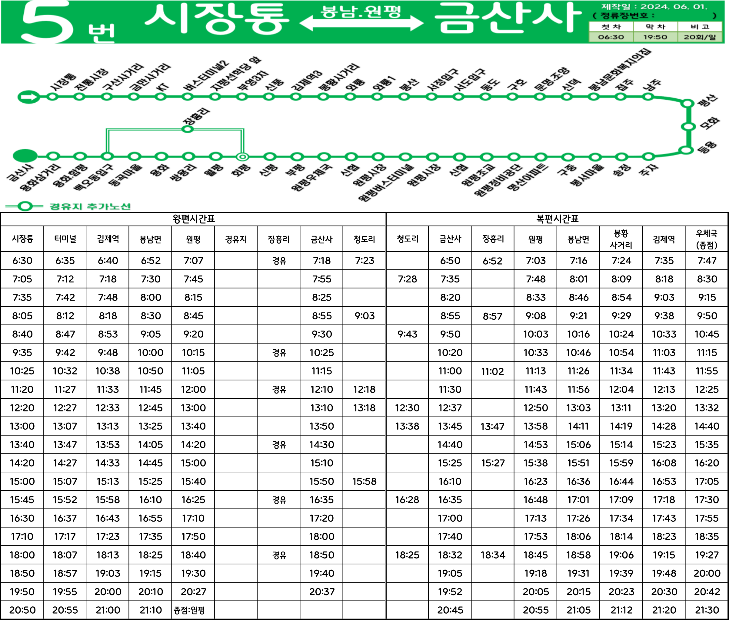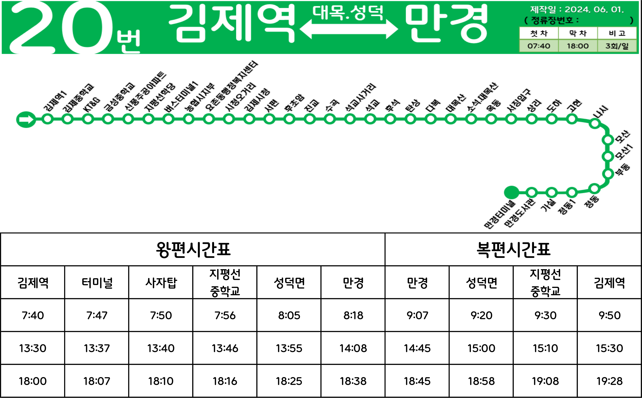 김제 20-1번: 김제역 ↔ (→ KT&G → 신풍주공아파트 → 김제공용버스터미널 → 김제우체국 → 김제시청 →/← 김제고 ← 김제농생명마이스터고 ← 진주아파트 ← 금성상회 ← 성산공원 ←) ↔ 진교 ↔ 석교 ↔ (→ 탄상 → 다복 → 대목산 → 옥동 →/← 탄하 ← 소목산 ←) ↔ 대석 ↔ 성덕초교 ↔ 상리(성덕면사무소) ↔ 도하 ↔ 고현 ↔ 나시 ↔ 정동 ↔ 원가실 ↔ 만경삼거리 ↔ 만경터미널