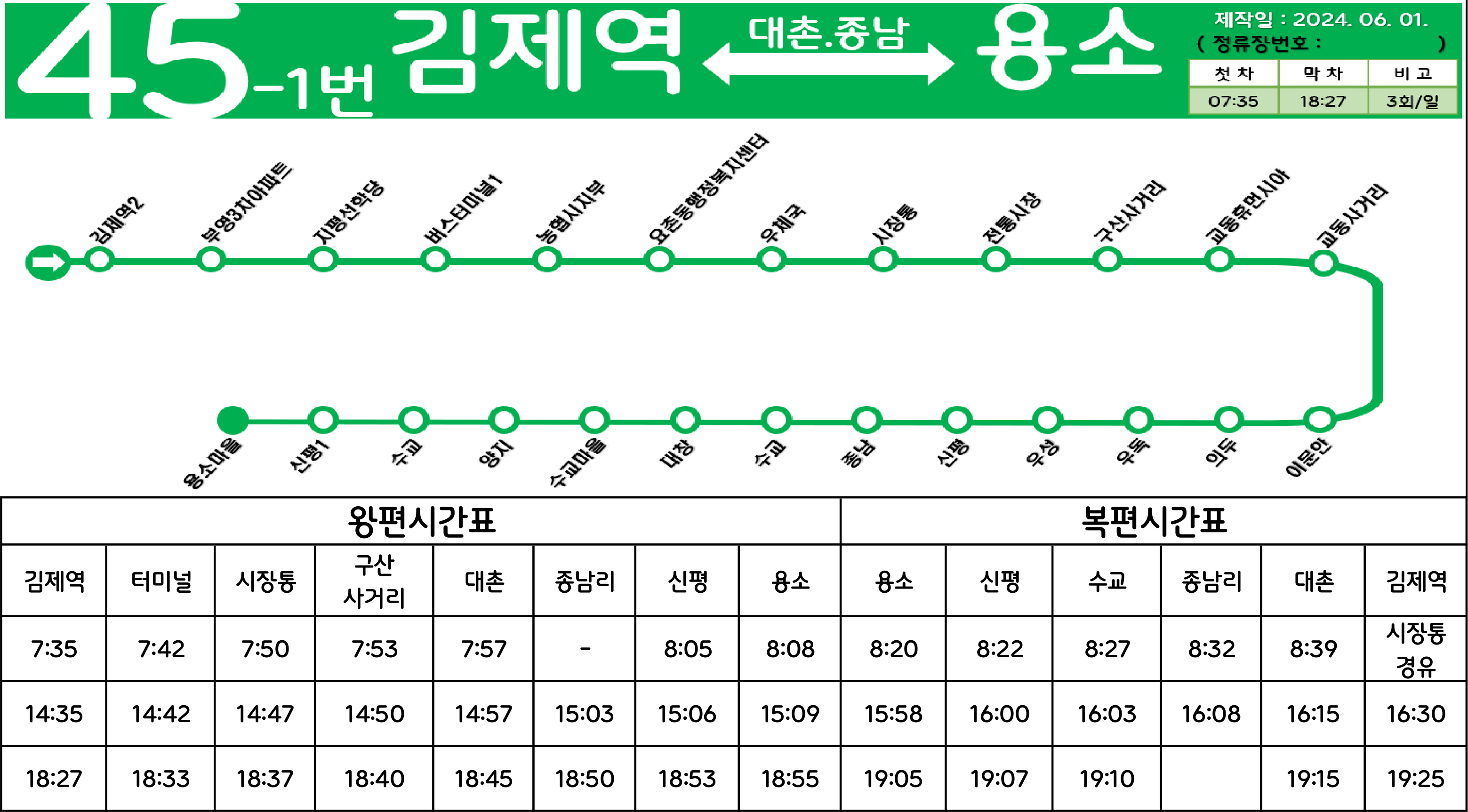 김제 45-1번: 김제역 ↔ 부영3차아파트 ↔ 김제공용버스터미널 ↔ 시청사거리 ↔ 시장통 ↔ 구산사거리 ↔ 교동휴먼시아 ↔ 후신 ↔ 방죽안 ↔ 복죽동.신평 ↔ (종남) ↔ 수교 ↔ 대창 ↔ 양지 ↔ 신평 ↔ 용소