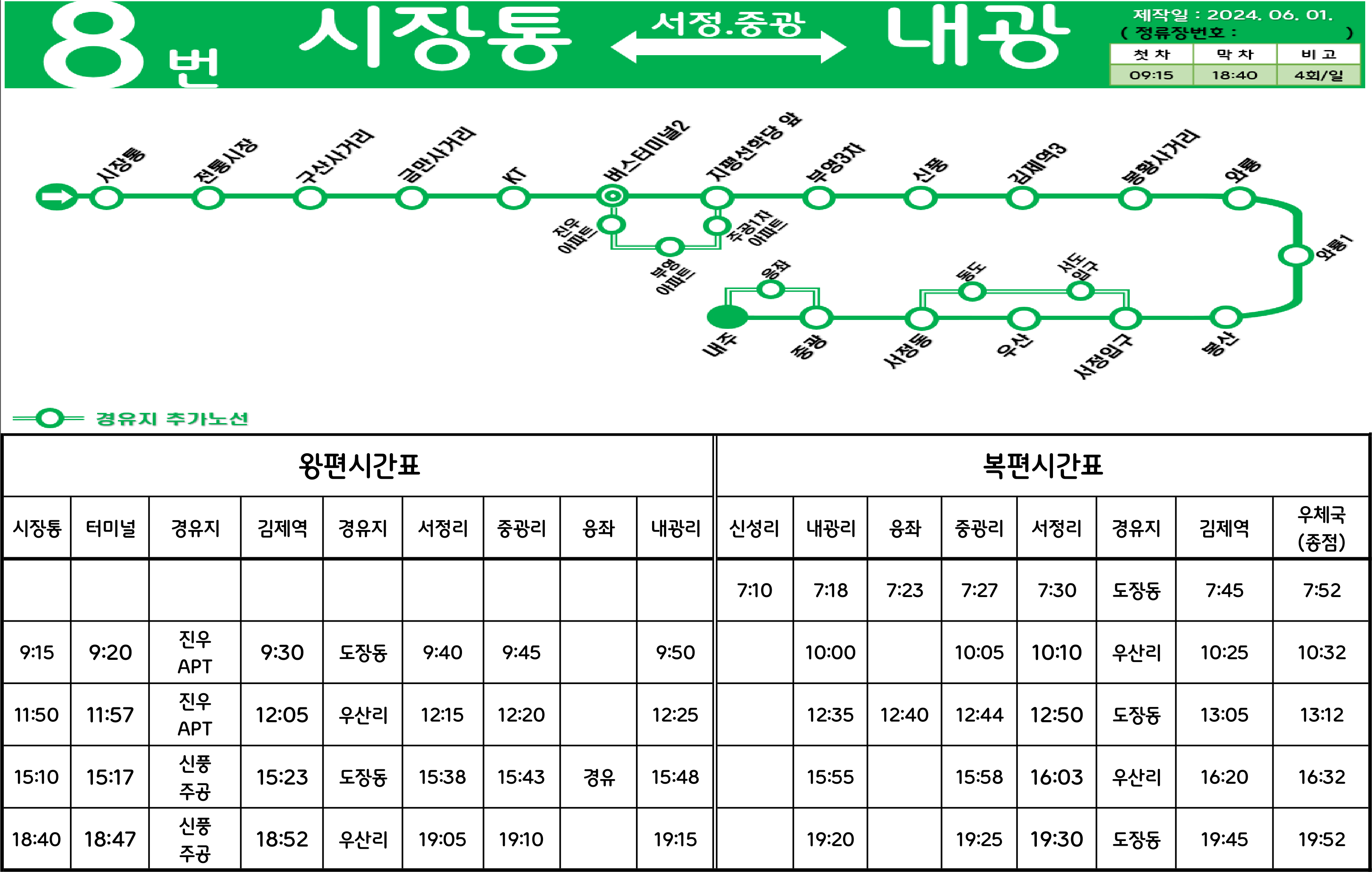 김제 8번: 시장통 ↔ (→ 구산사거리 → 김제종합고속시외버스터미널 → 진우아파트 → 부영3차아파트 →/← 김제우체국 ← 전화국 ← 시립도서관 ←) ↔ 김제역 ↔ 봉황사거리 ↔ 서정입구 ↔ (우산 ↔ 동중)(도장 ↔ 석정) ↔ 동중.서중 ↔ 서중 ↔ 중광 ↔ (응좌) ↔ 내광리.내주 ↔ 남주(봉남면사무소) ↔ (신덕)(송내 ↔ 신성)