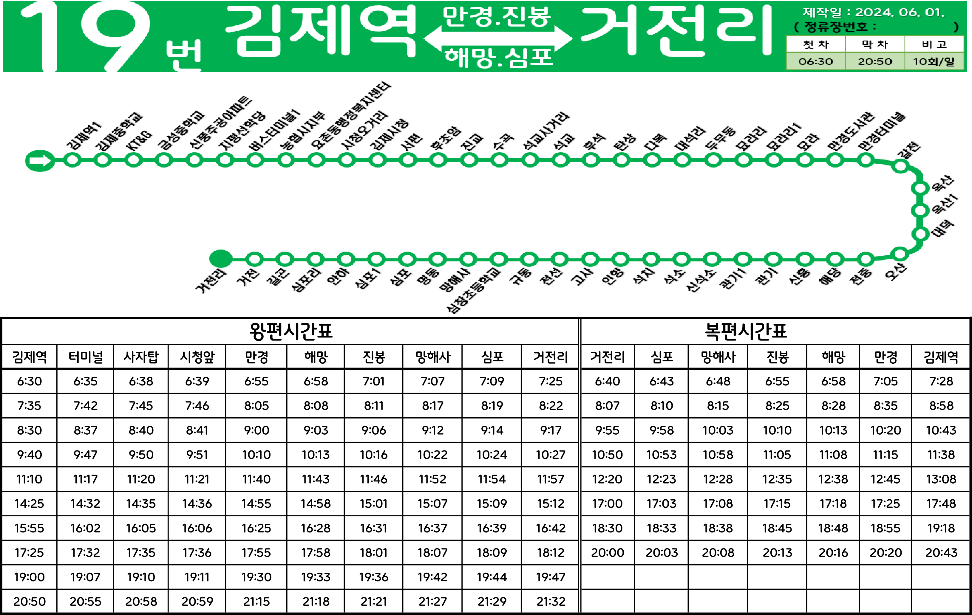 김제 19번: 김제역 ↔ (→ KT&G → 신풍주공아파트 → 김제종합고속시외버스터미널 → 김제우체국 → 김제시청 →/← 김제고 ← 김제농생명마이스터고 ← 진주아파트 ← 금성상회 ← 성산공원 ←) ↔ 진교 ↔ 석교 ↔ 탄상(서김제IC) ↔ 대석리 ↔ 묘라 ↔ 만경삼거리 ↔ 만경터미널 ↔ 해망 ↔ 관기(진봉면사무소) ↔ 인향 ↔ 망해사 ↔ 심포 ↔ 길곤 ↔ 거전