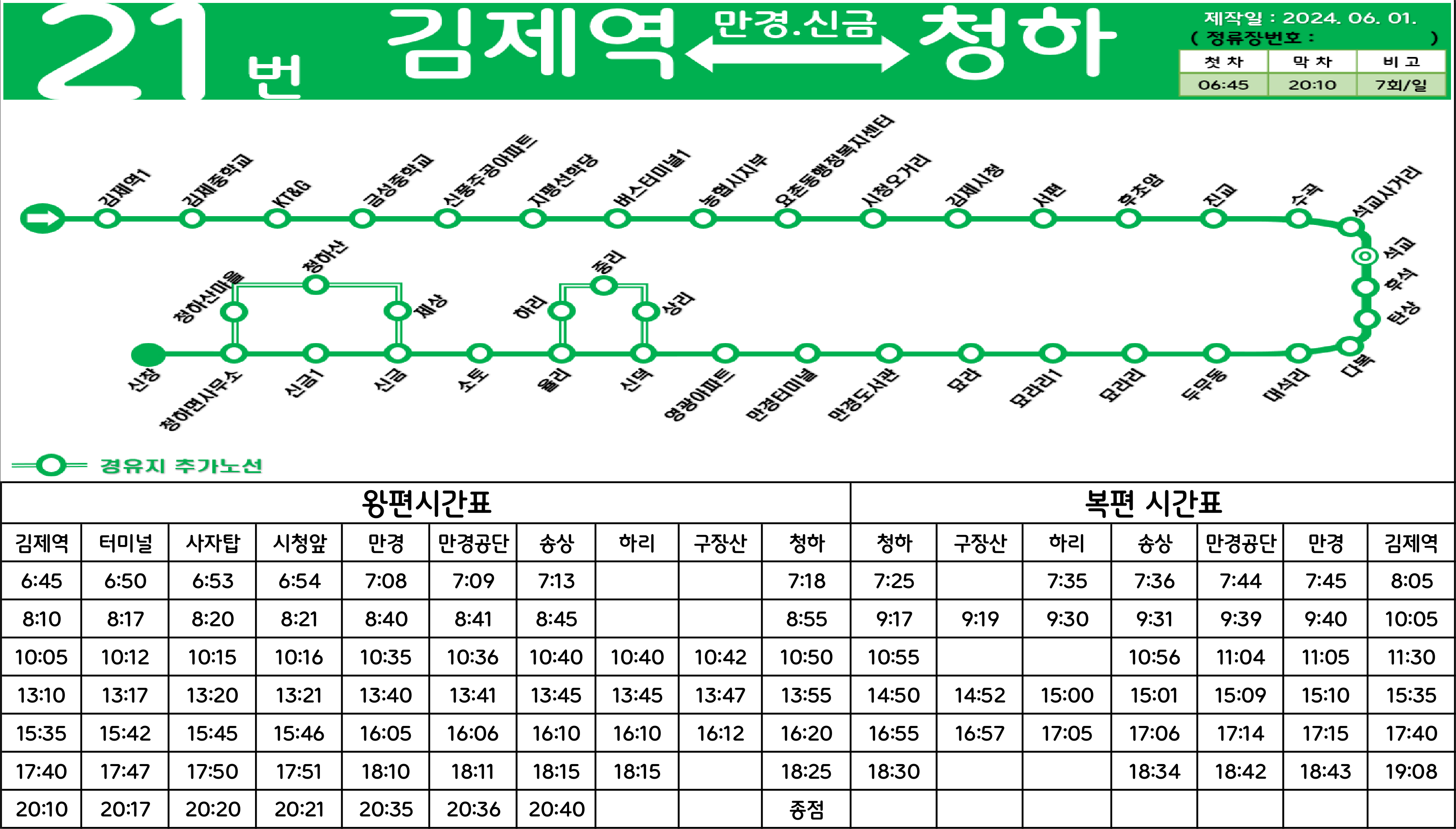 김제 21번: 김제역 ↔ (→ KT&G → 신풍주공아파트 → 김제공용버스터미널 → 김제우체국 → 김제시청 →/← 김제고 ← 김제농생명마이스터고 ← 진주아파트 ← 금성상회 ← 성산공원 ←) ↔ 진교 ↔ 석교 ↔ 탄상(서김제IC) ↔ 대석리 ↔ 묘라리 ↔ 만경삼거리 ↔ 만경터미널 ↔ 송상 ↔ (중리 ↔ 하리 ↔ 중리 ↔ 송상) ↔ 율리 ↔ 신금 ↔ (구장산 ↔ 제상 ↔ 청하산) ↔ 청하면사무소 ↔ 신창