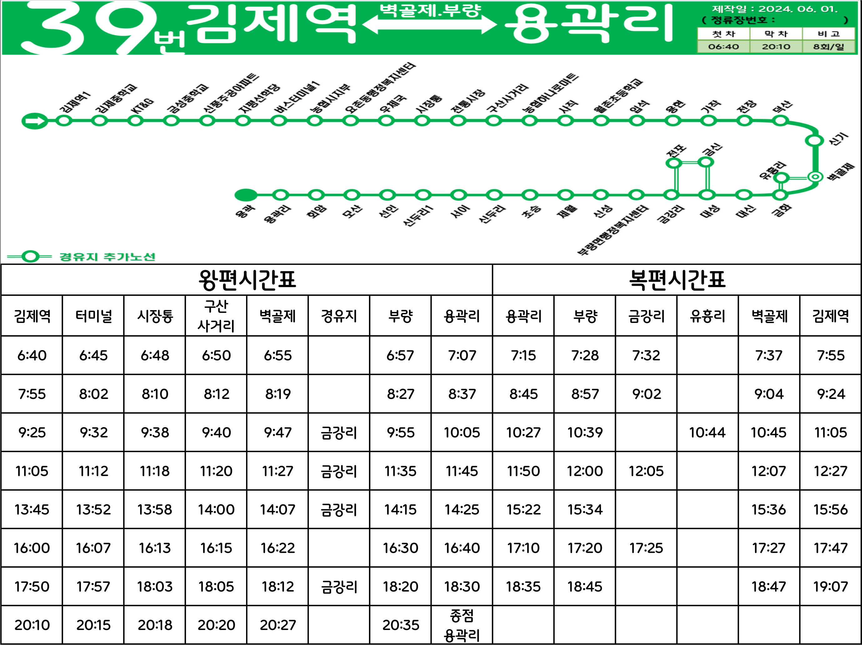 김제 39번: 김제역 ↔ (→ 신풍주공아파트 → 김제공용버스터미널 → 김제우체국 → 시장통 →/← 김제고 ← 김제농생명마이스터고 ←) ↔ 구산사거리 ↔ 중앙병원 ↔ 입석 ↔ 전장 ↔ 벽골제 ↔ (유흥) ↔ (금강리.전포) ↔ 부량면사무소 ↔ 초승 ↔ 서이 ↔ 선인 ↔ 회암 ↔ 용곽