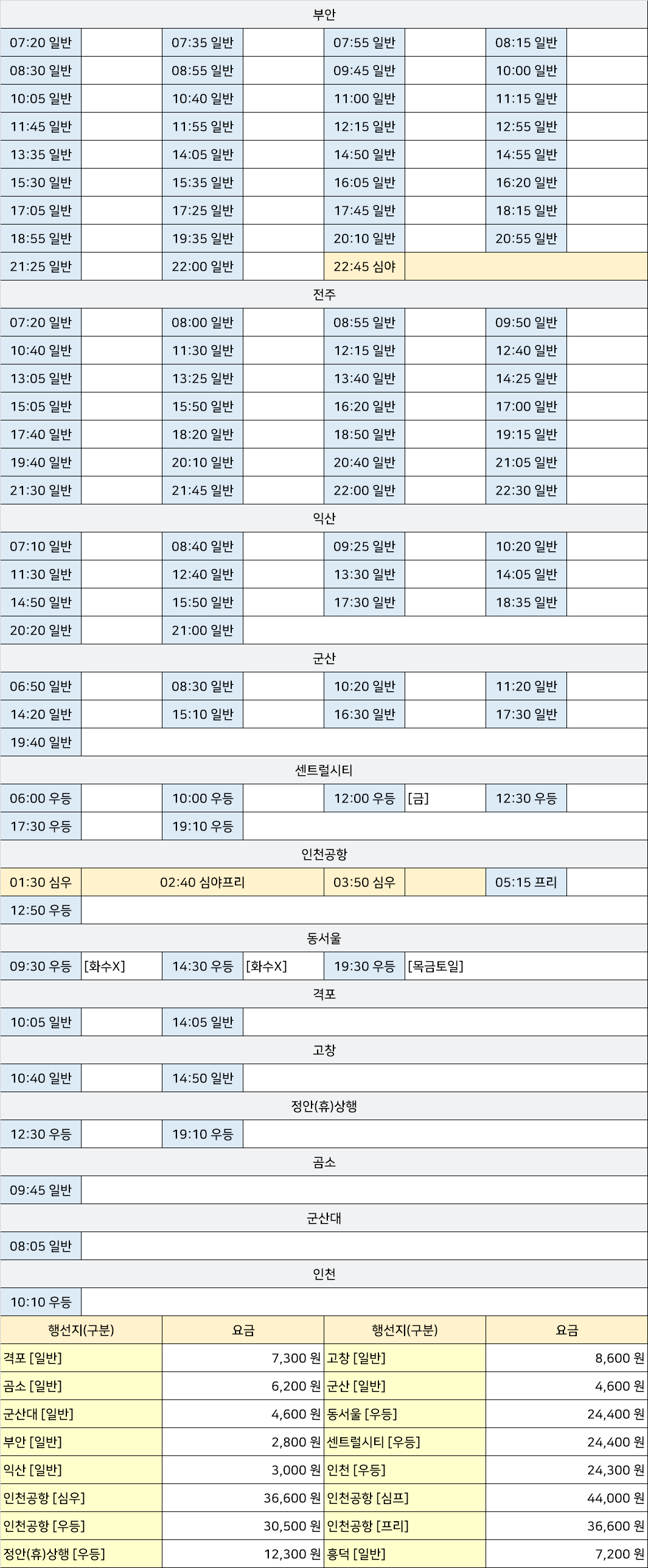 김제 시외버스 터미널 시간표/요금표 2025년 08월 01일 기준