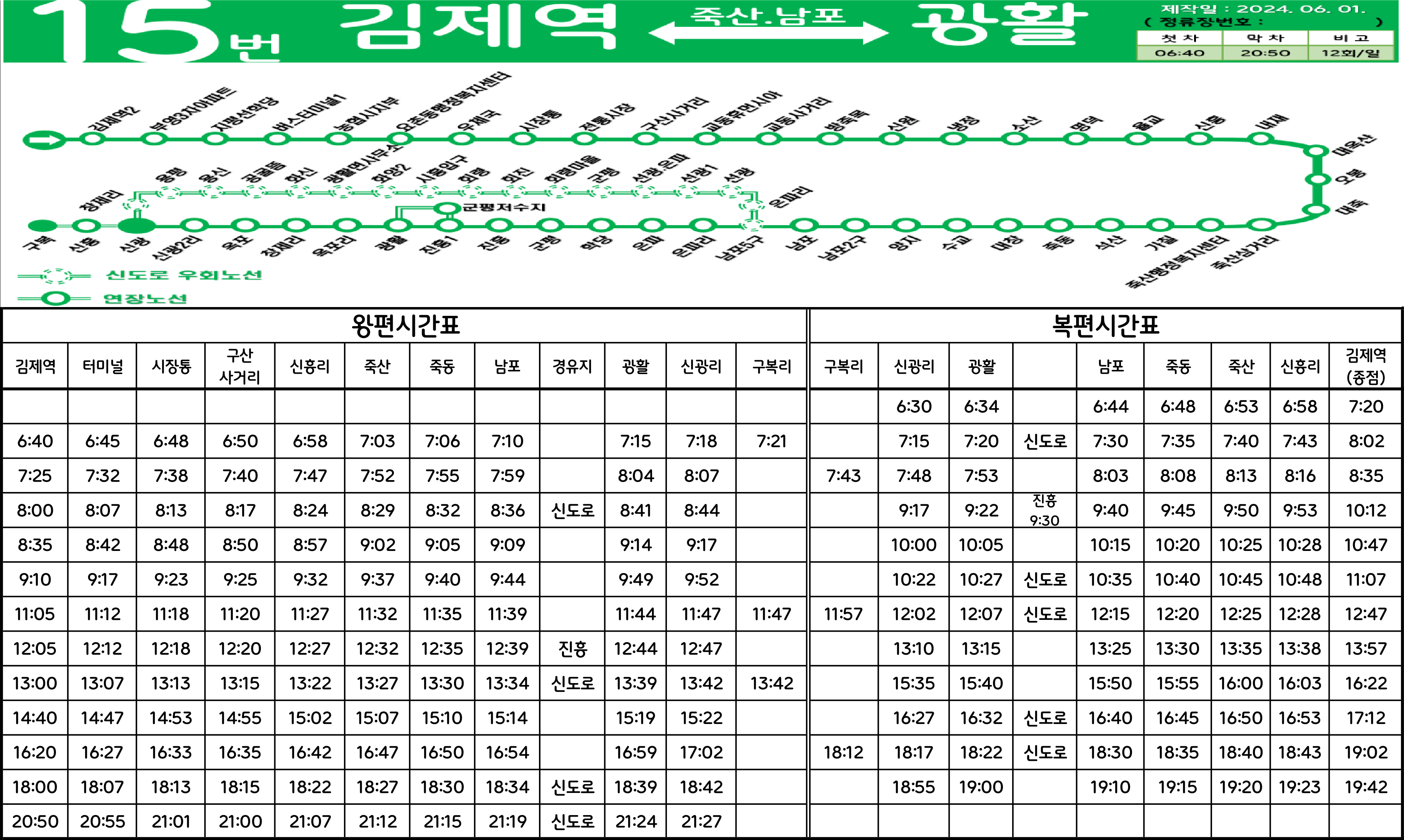 김제 15-1번: 김제역 ↔ (→ 부영3차아파트 → 김제종합고속시외버스터미널 → 김제우체국 → 시장통 →/← 시립도서관 ← 금만사거리 ←) ↔ 구산사거리 ↔ 중앙병원 ↔ 교동사거리 ↔ 후신 ↔ 방죽안(복죽.대촌) ↔ 신평 ↔ (종남) ↔ 수교 ↔ 대창 ↔ 양지 ↔ 남포 → 구도로 → 광활농협 → 신광 → (광활농협/화양2구) → (구도로/신도로)