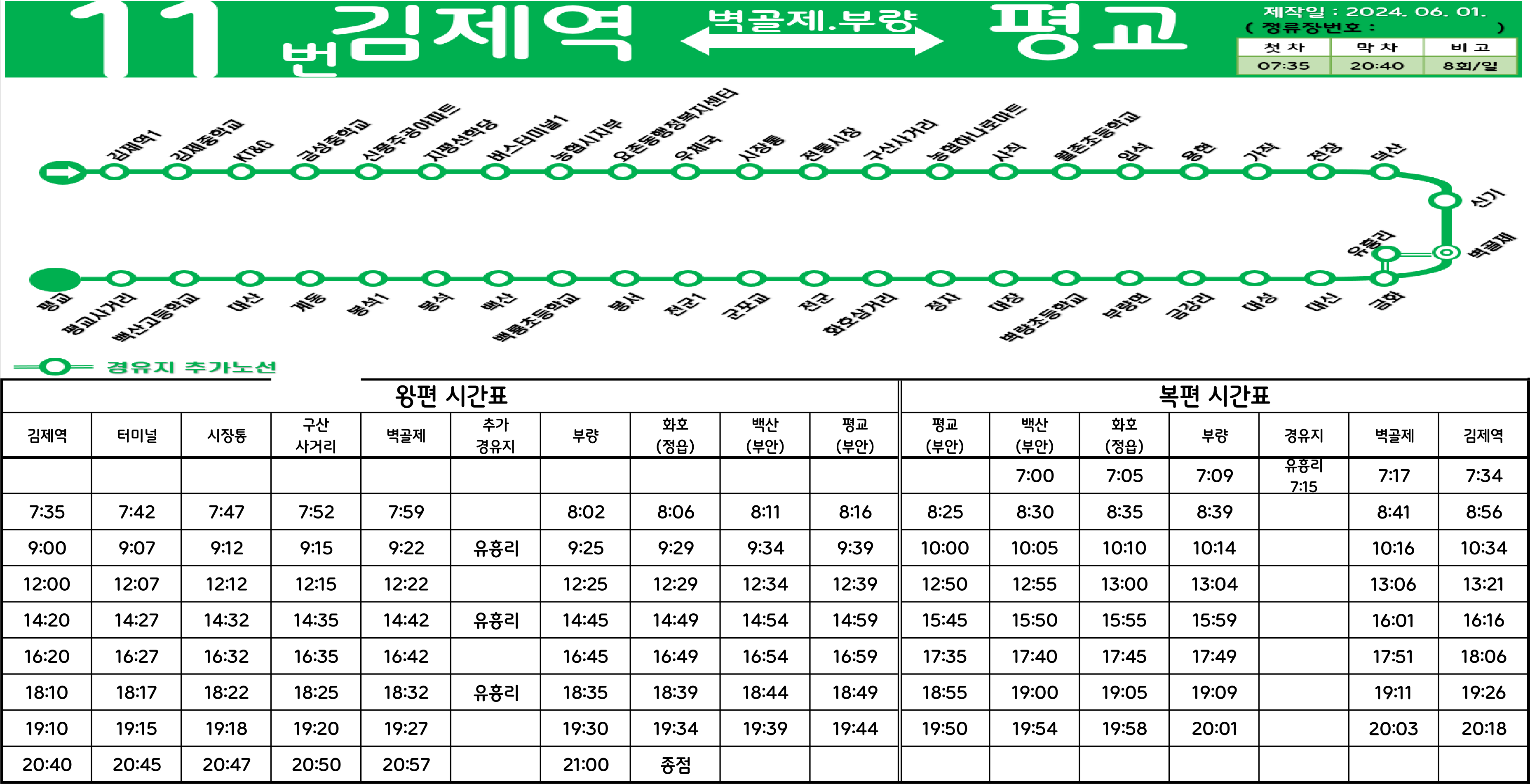 김제 11번: 김제역 ↔ (→ 신풍주공아파트 → 김제공용버스터미널 → 김제우체국 → 시장통 →/← 김제고 ← 김제농생명마이스터고 ←) ↔ 구산사거리 ↔ 중앙병원 ↔ 입석 ↔ 전장 ↔ 벽골제 ↔ (유흥) ↔ (금강리.전포) ↔ 부량면사무소 ↔ 화호삼거리 ↔ 군포교 ↔ 백룡초교 ↔ 봉석 ↔ 평교사거리 ↔ 평교