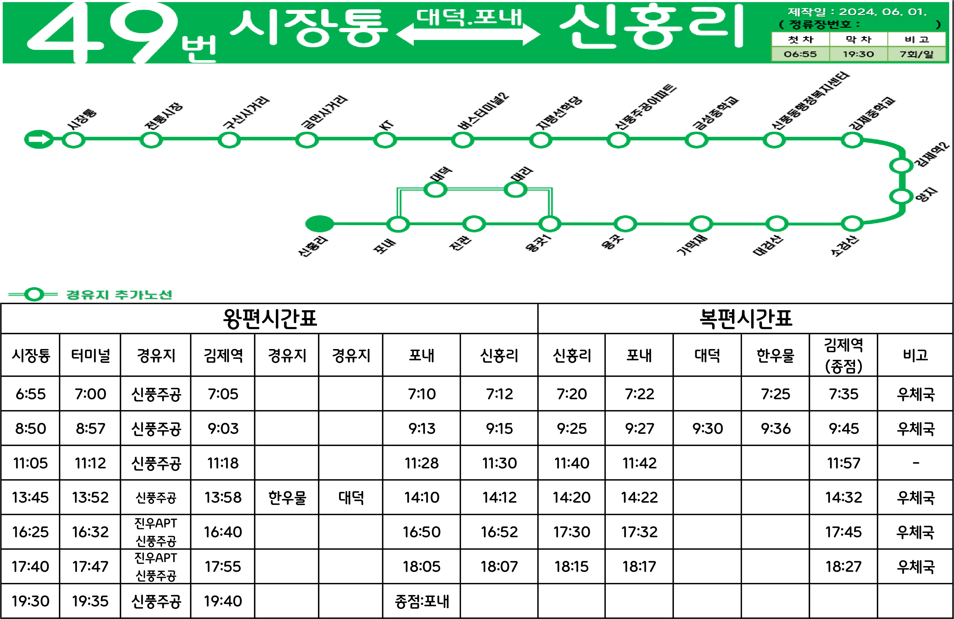 김제 49번: 시장통 ↔ (→ 구산사거리 → 김제공용버스터미널 → (→ 진우아파트 → 검산주공아파트 → 부영아파트 →) → 신풍주공아파트 → 금성여중 →/← 김제우체국 ← 터미널사거리 ←) ↔ 김제역 ↔ 대검산 ↔ 용곳 ↔ (대리.한우물) ↔ 진관 ↔ 포내 ↔ 홍정리(신홍마을)