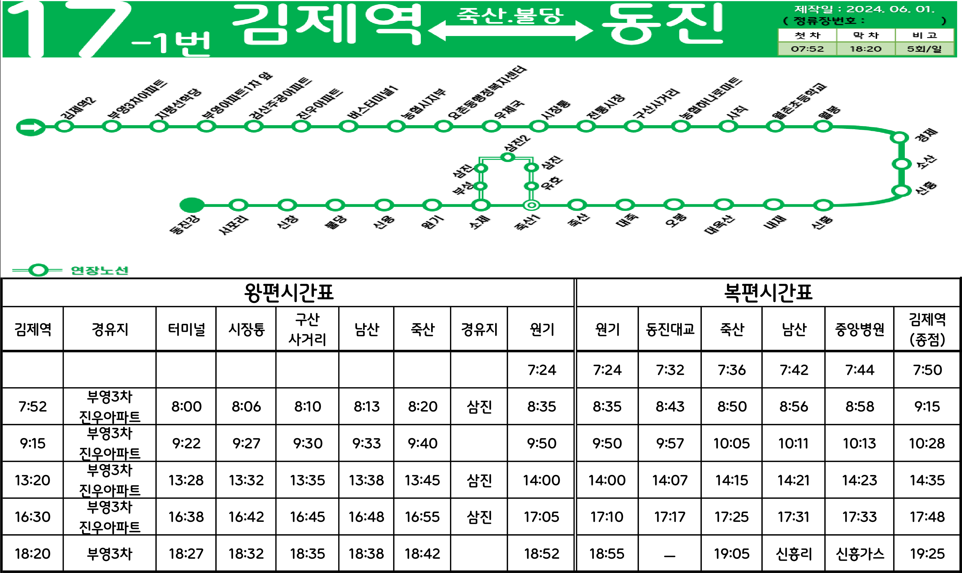김제 17-1번: 김제역 ↔ (→ 부영3차아파트 → 진우아파트 → 김제공용버스터미널 → 김제우체국 → 시장통 →/← 한국농어촌공사 ← 금만사거리 ←) ↔ 구산사거리 ↔ 중앙병원 ↔ 입석 ↔ 경제 ↔ 소산 ↔ 신흥 ↔ 죽산삼거리 ↔ (유호 ↔ 삼진 ↔ 유호) → 원기 → 신용 → 불당 → 신창 → 서포리 → 석천휴게소(동진대교) → 영구