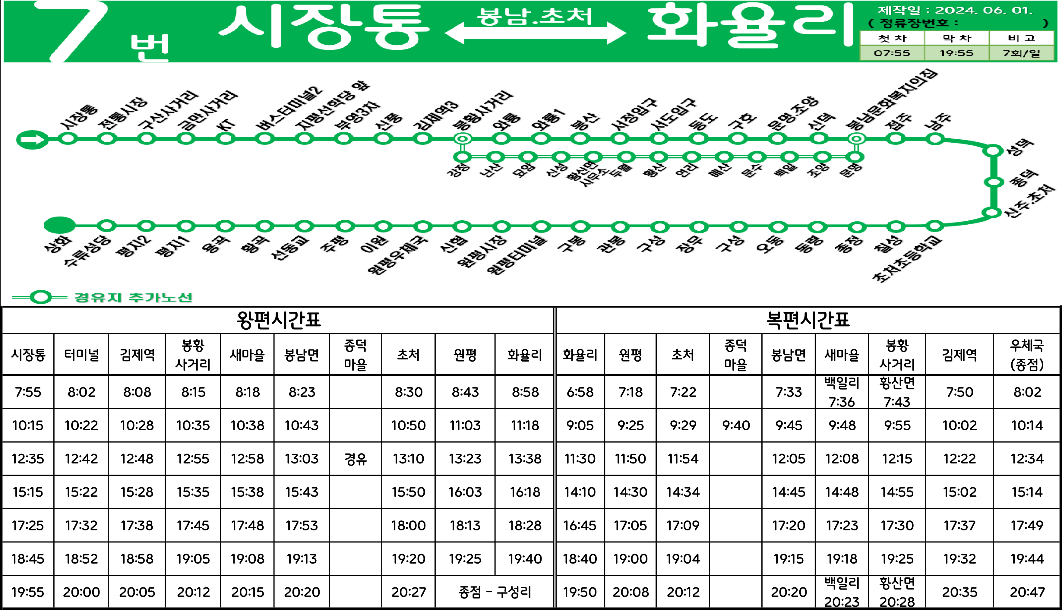 김제 7번: 시장통 ↔ (→ 구산사거리 → 김제공용버스터미널 → 부영3차아파트 → 김제역 →/← 김제우체국 ← 전화국 ← 시립도서관 ← 김제역 ← 부영3차아파트 ← 검산휴먼시아 ← 난산 ←) ↔ 봉황사거리 ↔ 서정입구 ↔ 도장 ↔ 신덕 ↔ 남주(봉남면사무소) ↔ 성덕 ↔ 종덕리.성덕경로당 ↔ 초처초교 ↔ 종정 ↔ 구성 ↔ 원평공용버스터미널 ↔ 원평우체국 ↔ 주평 ↔ 평지 ↔ 상화